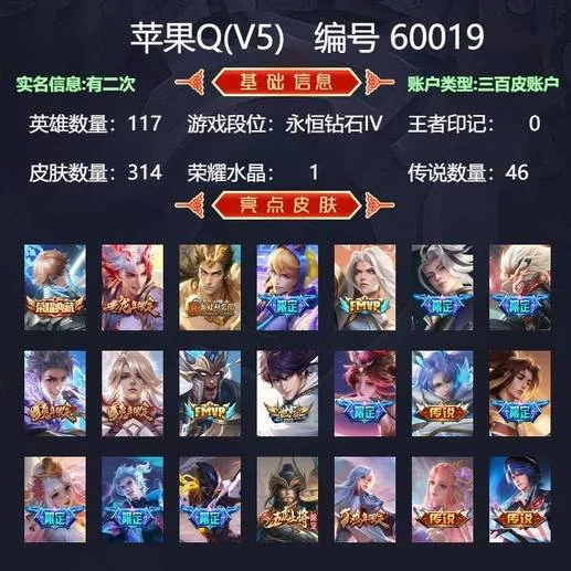 【DDD】蘋果QQ107區314皮1水46傳說0無雙(可二次)V9 星元:玉鸞吟 幽冥之眼 金色仲夏夜 星際治安官!榮耀水晶:鳴劍·曳影李白。優質限定造型:山海·蒼雷引曜,山海·熾霜斬李信,武聖關羽,鳳求凰李白,無雙飛將馬超,白虎志百里玄策,神威馬超。傳說造型:乘龍·淬吳鉤孫策,遇見神鼓呂布,妄想實況馬可波羅,灼幽烈陽東皇太一,鶴羽星尊諸葛亮,齊天大聖孫悟空,怒海麟威呂布,詩劍行李白,緋月行不知火
