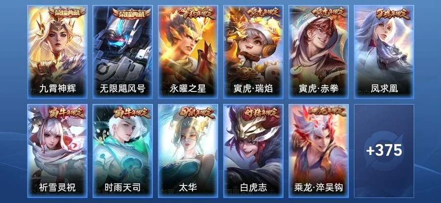 魯班七號-蔬鄉物語,高漸離-燃音魔法,安琪拉-乘龍·聚寶船,夢奇-頑趣,蒙恬-榮光聖徽,阿古朵-江河有靈,狂鐵-電玩高手,雅典娜-黎明之約,楊玉環-寅虎·心曲,孫臏-寅虎·展翼,廉頗-寅虎·御盾,韓信-傲雪梅槍,甄姬-女兒國國王,嫦娥-拒霜思,嬴政-優雅戀人,豬八戒-豬悟能,莊周-高山流水,孫悟空-孫行者,干將莫邪-真愛魔法,老夫子-航海奇遇記,魯班七號-乒乒小將,大喬-白鶴梁神女,伽羅-天狼溯光者,米萊狄-胡桃異想國,花木蘭-默契交鋒,孫臏-天狼運算者,牛魔-奔雷神使,元歌-雲間偶戲,呂布-御風驍將,羋月-白晶晶,蒙犽-狂想玩偶喵,雲中君-纖雲弄巧,莊周-雲端築夢師,裴擒虎-李小龍,百里玄策-原初追逐者,馬可波羅-暗影遊獵,馬超-神威,張飛-虎魄,上官婉兒-天狼繪夢者,阿軻-迷蹤麗影,黃忠-烈魂,趙雲-龍膽,李元芳-銀河之約,甄姬-幽恆,莊周-玄嵩,妲己-時之彼端,典韋-岱宗,韓信-飛衡,曹操-天狼征服者,蘭陵王-馴魔獵人,上官婉兒-梁祝,安琪拉-魔法小廚娘,裴擒虎-天狼狩獵者,花木蘭-瑞麟志,蘇烈-玄武志,嬴政-白晝王子,孫悟空-大聖娶親,露娜-一生所愛,干將莫邪-冰霜戀舞曲,百里守約-朱雀志,鎧-青龍志,東皇太一-逐夢之光,楊玉環-遇見飛天,關羽-冰鋒戰神,妲己-熱情桑巴,公孫離-蜜橘之夏,哪吒-逐夢之翼,雅典娜-神奇女俠,花木蘭-青春決賽季,后羿-輝光之辰,項羽-霸王別姬,虞姬-霸王別姬,馬可波羅-逐夢之星,韓信-逐夢之影,小喬-純白花嫁,周瑜-真愛至上,趙雲-引擎之心,孫悟空-至尊寶,王昭君-鳳凰于飛,狄仁傑-魔術師,趙雲-皇家上將