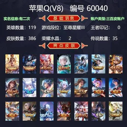 【DDT】蘋果QQ124區386皮3水35傳說 1星元:零號雷霆 對抗路45段 金標豬八戒 1.2W金標馬超 金標夏侯惇 差3W多積分就v10了 (可二次)V8!榮耀水晶:九霄神輝花木蘭,無限颶風號夏侯惇。優質限定造型:無雙飛將馬超,祈雪靈祝公孫離,武聖關羽,白虎志百里玄策,天魔繚亂呂布,鳳求凰李白,神威馬超,梅西裴擒虎,至尊寶孫悟空。傳說造型:乘龍·淬吳鉤孫策,時雨天司諸葛亮,雲霓雀翎虞姬,寅虎