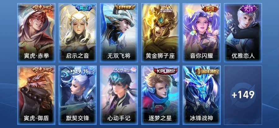 劉禪-天才門將,明世隱-虹雲星官,鍾無豔-海灘麗影,趙雲-忍·炎影,伽羅-花見巫女,孫悟空-西部大鏢客,關羽-天啟騎士,張良-古海尋蹤,大喬-守護之力,豬八戒-潮玩探月行,孫臏-天使之翼,曹操-超能戰警,百里守約-絕影神槍,項羽-帝國元帥,哪吒-次元突破,阿古朵-熊喵少女,貂蟬-異域舞娘,蘭陵王-暗隱獵獸者,劉禪-秘密基地,諸葛亮-星航指揮官,宮本武藏-未來紀元,蒙恬-蔚藍守將,夢奇-美夢成真,沈夢溪-棒球奇才,姜子牙-時尚教父,墨子-進擊墨子號,鍾馗-地府判官,孫臏-歸虛夢演,老夫子-潮流仙人,李元芳-特種部隊,瀾-孤獵,米萊狄-契約魔法,曜-歸虛夢演,劉禪-喚靈魔甲,宮本武藏-鬼劍武藏,暃-碧珀緋影,桑啟-畫中遊,不知火舞-魅語,墨子-龍騎士,達摩-拳王,李白-範海辛,老夫子-功夫老勺,劉備-紐約教父,夏洛特-永晝,韓信-教廷特使,盾山-極冰防禦線,扁鵲-救世之瞳,蒙犽-歸虛夢演,貂蟬-聖誕戀歌,劉邦-虎嘯劍宗,呂布-野性能量,曹操-幽靈船長,露娜-哥特玫瑰,西施-歸虛夢演,廉頗-地獄巖魂,劉禪-英喵野望,狂鐵-特工戰影,劉備-漢昭烈帝,孫臏-未來旅行,雅典娜-冰冠公主,司馬懿-魘語軍師,司空震-啟蟄,楊玉環-霓裳曲,扁鵲-化身博士,魯班七號-木偶奇遇記,達摩-大發明家,蒙恬-秩序獵龍將,魯班大師-乓乓大師,豬八戒-年年有餘,雲纓-赤焰之纓,花木蘭-劍舞者,白起-星夜王子,王昭君-偶像歌手,蘇烈-堅韌之力,張良-繽紛繪卷,花木蘭-水晶獵龍者,莊周-奇妙博物學,呂布-聖誕狂歡,鏡-冰刃幻境,露娜-紫霞仙子,露娜-瓷語鑑心,關羽-龍騰萬里,孫尚香-水果甜心,楊戩-次元傲視,成吉思汗-維京掠奪者,橘右京-修羅,趙雲-未來紀元,馬可波羅-激情綠茵,李信-灼熱之刃,典韋-黃金武士,狄仁傑-鷹眼統帥,裴擒虎-街頭旋風,公孫離-花間舞,劉備-萬事如意,宮本武藏-永珍初新,盾山-圓桌騎士,花木蘭-兔女郎,妲己-魅力維加斯,盤古-創世神祝,馬超-倖存者,亞瑟-死亡騎士,妲己-少女阿狸