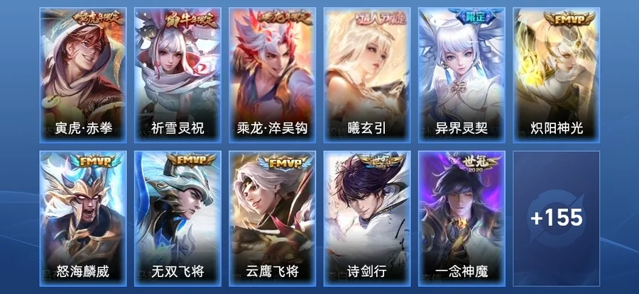 伽羅-琥珀紀元,姬小滿-妄想食味,蒙恬-榮光聖徽,蒙犽-百解令,司空震-地獄燃心,暃-星界遊俠,馬可波羅-山海·玄木吟,元歌-無心,夢奇-頑趣,鬼谷子-五穀豐年,鏡-匿光追影者,百里玄策-原初追逐者,雅典娜-黎明之約,嫦娥-拒霜思,狄仁傑-魔術師,莊周-高山流水,趙雲-皇家上將,老夫子-航海奇遇記,干將莫邪-冰霜戀舞曲