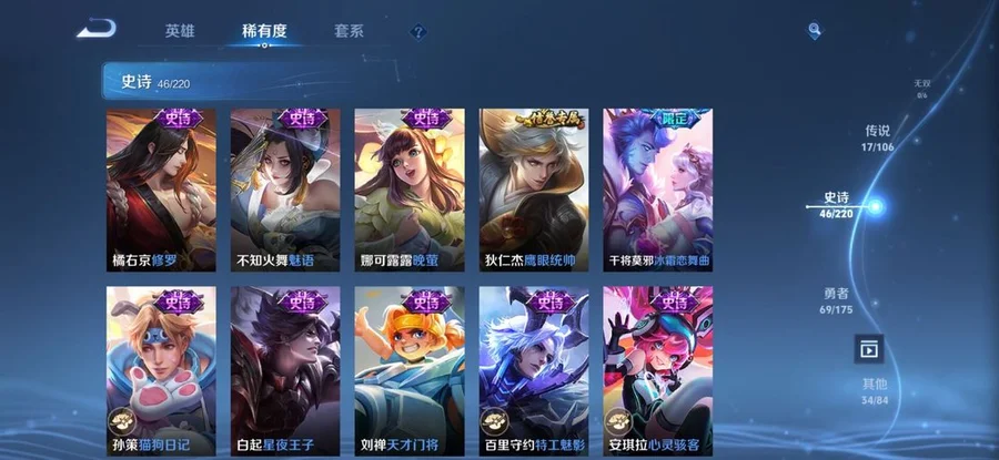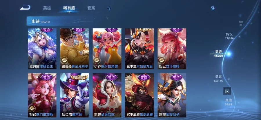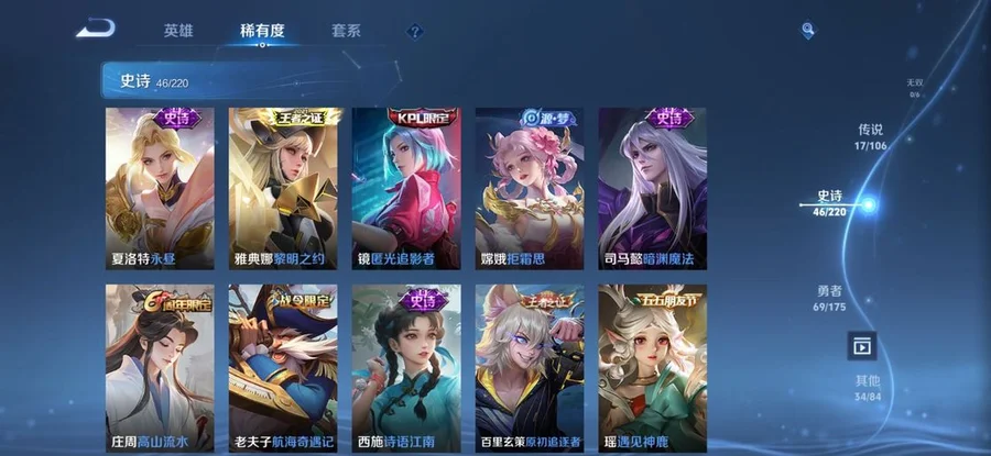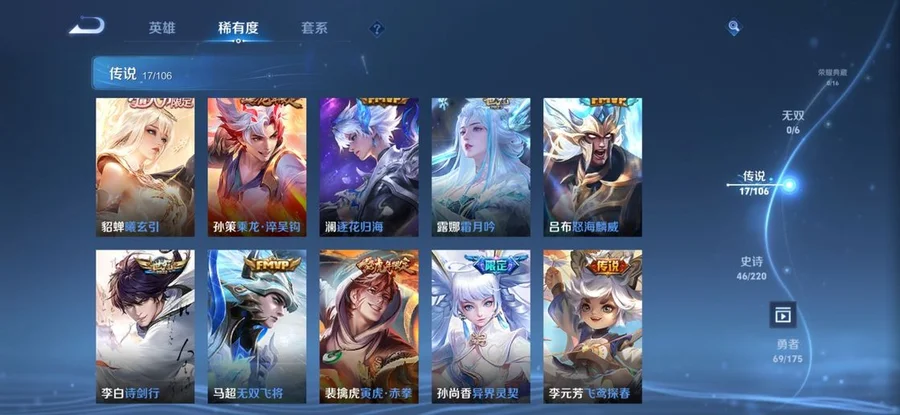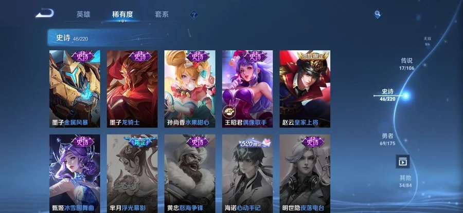 扁鵲-救世之瞳,鏡-冰刃幻境,太乙真人-圓桌騎士,黃忠-芝加哥教父,阿軻-愛心護理,盾山-圓桌騎士,白起-星夜王子,羋月-紅桃皇后,狂鐵-命運角鬥場,諸葛亮-黃金分割率,西施-詩語江南,桑啟-畫中遊,盤古-創世神祝,趙雲-忍·炎影,東皇太一-東海龍王,伽羅-花見巫女,太乙真人-勁辣紅鍋,鍾無豔-海灘麗影,百里守約-特工魅影,墨子-龍騎士,艾琳-流音漫舞,甄姬-冰雪圓舞曲,夢奇-美夢成真,亞連-破局者,張良-古海尋蹤,扁鵲-化身博士,趙雲-白執事,程咬金-無雙福將,姬小滿-零食大作戰,典韋-黃金武士,豬八戒-潮玩探月行,萊西奧-西部遊俠,曹操-超能戰警,王昭君-偶像歌手,諸葛亮-掌控之力,女媧-尼羅河女神,楊玉環-霓裳曲,白起-樂園追獵者,白起-白色死神,小喬-繽紛獨角獸,橘右京-修羅,孫策-貓狗日記,上官婉兒-修竹墨客,哪吒-次元突破,海月-幻泉霧影,西施-歸虛夢演,李白-範海辛,劉禪-天才門將,劉禪-秘密基地,張飛-五福同心,司空震-啟蟄,蒙恬-蔚藍守將,蒙犽-歸虛夢演,宮本武藏-鬼劍武藏,劉禪-喚靈魔甲,貂蟬-聖誕戀歌,虞姬-加勒比小姐,夏洛特-永晝,達摩-拳王,成吉思汗-維京掠奪者,呂布-野性能量,牛魔-西部大鏢客,楊戩-埃及法老,娜可露露-晚螢,露娜-紫霞仙子,露娜-緋紅之刃,百里守約-絕影神槍,馬可波羅-潮玩牛仔,宮本武藏-霸王丸,狂鐵-特工戰影,墨子-金屬風暴,蒙恬-秩序獵龍將,孫策-海之征途,瀾-孤獵,韓信-街頭霸王,司馬懿-暗淵魔法,不知火舞-魅語,李信-灼熱之刃,馬超-倖存者,妲己-女僕咖啡,司馬懿-魘語軍師,弈星-踏雪尋梅,花木蘭-水晶獵龍者,姜子牙-熾熱元素使,狄仁傑-鷹眼統帥,花木蘭-兔女郎,魯班大師-乓乓大師,馬可波羅-激情綠茵,雲纓-赤焰之纓,哪吒-三太子,孫尚香-水果甜心,張良-繽紛繪卷,蘇烈-堅韌之力,安琪拉-心靈駭客,露娜-瓷語鑑心,楊戩-次元傲視,瑤-遇見神鹿,雅典娜-冰冠公主,關羽-龍騰萬里,雅典娜-戰爭女神,公孫離-花間舞,妲己-魅力維加斯,裴擒虎-街頭旋風,亞瑟-死亡騎士