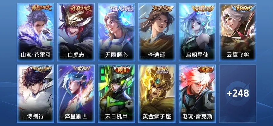 瀾-逐花歸海,宮本武藏-驚梅引,瀾-電玩·雷克斯,鎧-絳天戰甲,宮本武藏-地獄之眼,李白-詩劍行,趙雲-淬星耀世,孫尚香-末日機甲,曜-雲鷹飛將,達摩-黃金獅子座