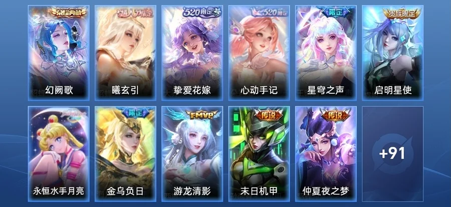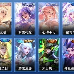 豬八戒-潮玩探月行,鬼谷子-阿摩司公爵,諸葛亮-掌控之力,妲己-女僕咖啡,呂布-末日機甲,安琪拉-玩偶對對碰,白起-白色死神,不知火舞-魅語,沈夢溪-鯊炮海盜貓,李信-灼熱之刃,孫臏-天使之翼,孫尚香-時之戀人,瀾-孤獵,馬超-倖存者,王昭君-偶像歌手,張良-幽蘭居士,劉備-潮玩造夢師,孫臏-未來旅行,嬴政-搖滾巨星,馬可波羅-激情綠茵,孫尚香-沉穩之力,韓信-教廷特使,大喬-貓狗日記,裴擒虎-街頭旋風,貂蟬-異域舞娘,鍾無豔-海灘麗影,弈星-踏雪尋梅,鎧-龍域領主,張飛-亂世虎臣,張良-繽紛繪卷,妲己-少女阿狸,蔡文姬-薔薇王座,蔡文姬-舞動綠茵,明世隱-虹雲星官,嫦娥-露花倒影,露娜-瓷語鑑心,張良-古海尋蹤,孫臏-歸虛夢演,瑤-遇見神鹿,娜可露露-晚螢,小喬-繽紛獨角獸,扁鵲-救世之瞳,孫尚香-水果甜心,羋月-紅桃皇后,桑啟-畫中遊,小喬-萬聖前夜,花木蘭-劍舞者,王昭君-幻想奇妙夜,李白-敏銳之力,瑤-森,伽羅-花見巫女,花木蘭-兔女郎,西施-歸虛夢演,鏡-冰刃幻境,大喬-伊勢巫女,大喬-守護之力,露娜-哥特玫瑰,貂蟬-聖誕戀歌,上官婉兒-修竹墨客,公孫離-花間舞,甄姬-冰雪圓舞曲,楊玉環-霓裳曲,花木蘭-水晶獵龍者,王昭君-精靈公主