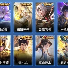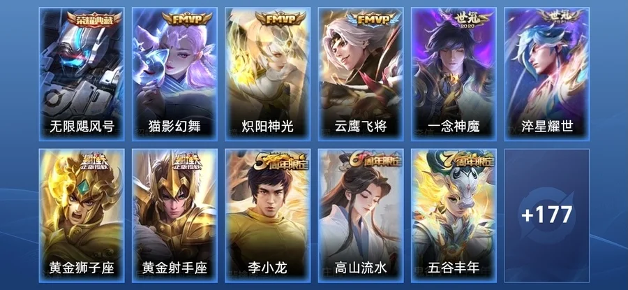后羿-黃金射手座,貂蟬-貓影幻舞,鏡-熾陽神光,趙雲-淬星耀世,曜-雲鷹飛將,李信-一念神魔,達摩-黃金獅子座