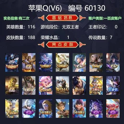 【DDD】蘋果QQ116區188皮1水7傳說0無雙(可二次)V6!榮耀水晶:無限颶風號夏侯惇。傳說造型:黃金射手座后羿,貓影幻舞貂蟬,熾陽神光鏡,淬星耀世趙雲,雲鷹飛將曜,一念神魔李信,黃金獅子座達摩。限定造型:擒濤扼浪裴擒虎,雲中旅人李元芳。史詩造型:榮光聖徽蒙恬,江河有靈阿古朵,鷹眼統帥狄仁傑,頑趣夢奇,無心元歌,五穀豐年鬼谷子,未來紀元趙雲,超時空戰士鍾無豔,電玩高手狂鐵,冰雪圓舞曲甄姬,繽