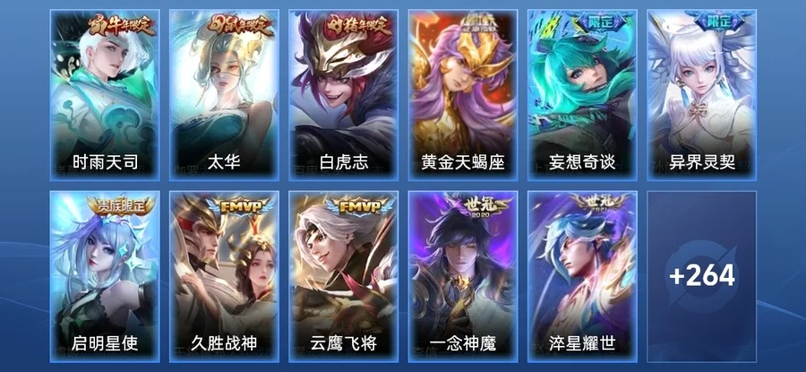 蘭陵王-暗隱獵獸者,戈婭-危途狂花,盾山-極冰防禦線,魯班大師-歸虛夢演,雲纓-赤焰之纓,李元芳-特種部隊,李白-敏銳之力,孫臏-未來旅行,成吉思汗-維京掠奪者,劉邦-聖殿之光,司空震-啟蟄,公孫離-花間舞,桑啟-畫中遊,曹操-超能戰警,呂布-末日機甲,魯班大師-乓乓大師,鍾無豔-聚星閃耀,張良-古海尋蹤,露娜-緋紅之刃,夢奇-美夢成真,宮本武藏-未來紀元,嫦娥-露花倒影,海月-浮夢羅煙,李元芳-妄想特派,沈夢溪-棒球奇才,元歌-午夜歌劇院,王昭君-精靈公主,安琪拉-心靈駭客,小喬-萬聖前夜,貂蟬-異域舞娘,太乙真人-勁辣紅鍋,狄仁傑-錦衣衛,豬八戒-潮玩探月行,關羽-龍騰萬里,花木蘭-水晶獵龍者,安琪拉-玩偶對對碰,姜子牙-熾熱元素使,甄姬-花好人間,狂鐵-特工戰影,鏡-冰刃幻境,露娜-哥特玫瑰,盤古-重灌意志,張良-繽紛繪卷,蒙恬-秩序獵龍將,橘右京-修羅,老夫子-潮流仙人,墨子-金屬風暴,曹操-幽靈船長,劉禪-秘密基地,瀾-孤獵,甄姬-冰雪圓舞曲,太乙真人-圓桌騎士,廉頗-無盡征程,白起-白色死神,劉禪-天才門將,孫尚香-時之戀人,趙雲-忍·炎影,盾山-圓桌騎士,盤古-創世神祝,西施-歸虛夢演,瑤-森,達摩-大發明家,鎧-曙光守護者,程咬金-功夫廚神,哪吒-三太子,哪吒-次元突破,阿軻-節奏熱浪,大喬-守護之力,魯班七號-黑桃隊長,李元芳-逐浪之夏,虞姬-加勒比小姐,白起-星夜王子,楊戩-埃及法老,劉備-漢昭烈帝,蔡文姬-舞動綠茵,李信-灼熱之刃,黃忠-芝加哥教父,沈夢溪-鯊炮海盜貓,孫臏-歸虛夢演,典韋-黃金武士,馬超-倖存者,王昭君-偶像歌手,狄仁傑-鷹眼統帥,曜-歸虛夢演,馬可波羅-激情綠茵,孫尚香-水果甜心,蔡文姬-薔薇王座,伽羅-箭羽風息,蘇烈-堅韌之力,諸葛亮-黃金分割率,鬼谷子-阿摩司公爵,孫策-貓狗日記,莊周-奇妙博物學,張飛-亂世虎臣,阿軻-愛心護理,曹操-死神來了,嬴政-暗夜貴公子,夏侯惇-乘風破浪,韓信-白龍吟,孫策-海之征途,牛魔-西部大鏢客,張良-幽蘭居士,墨子-龍騎士,亞瑟-心靈戰警,關羽-天啟騎士,劉備-萬事如意,裴擒虎-街頭旋風,上官婉兒-修竹墨客,露娜-紫霞仙子,項羽-科學大爆炸,呂布-聖誕狂歡,李白-千年之狐,安琪拉-如懿,劉邦-德古拉伯爵,雅典娜-戰爭女神,伽羅-花見巫女,達摩-拳王,司馬懿-魘語軍師,鬼谷子-幻樂之宴,劉備-紐約教父,諸葛亮-掌控之力,小喬-繽紛獨角獸,百里守約-特工魅影,墨子-進擊墨子號,孫尚香-沉穩之力,老夫子-功夫老勺,牛魔-制霸全明星,鍾無豔-生化警戒,百里玄策-威尼斯狂歡,弈星-踏雪尋梅,王昭君-幻想奇妙夜,張飛-五福同心,鍾無豔-海灘麗影,程咬金-華爾街大亨,宮本武藏-霸王丸,女媧-尼羅河女神,阿軻-致命風華,蘇烈-愛與和平,宮本武藏-永珍初新,扁鵲-化身博士,韓信-教廷特使,花木蘭-劍舞者,百里守約-絕影神槍,羋月-紅桃皇后,孫悟空-西部大鏢客,韓信-街頭霸王,張良-一千零一夜,劉禪-英喵野望,大喬-伊勢巫女,魯班七號-福祿兄弟,妲己-魅力維加斯,諸葛亮-星航指揮官,妲己-少女阿狸,亞瑟-死亡騎士,扁鵲-救世之瞳,蒙犽-歸虛夢演,劉禪-喚靈魔甲,瀾-賞金獵手,高漸離-天秀·音浪,艾琳-奇遇舞章,呂布-野性能量,小喬-丁香結,宮本武藏-鬼劍武藏,后羿-精靈王,程咬金-無雙福將,魯班七號-電玩小子,明世隱-虹雲星官