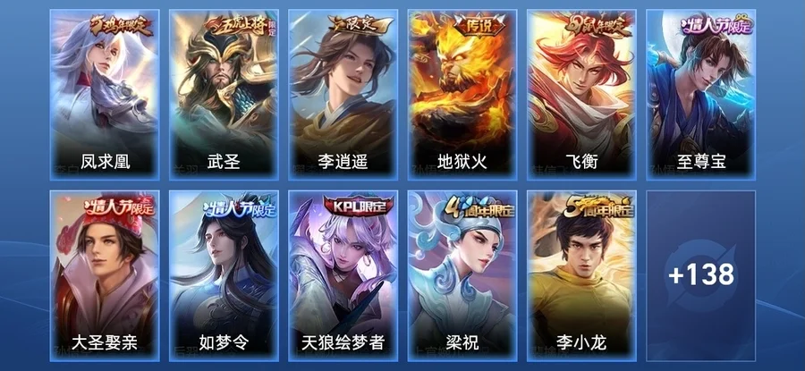 甄姬-花好人間,百里守約-特工魅影,蘭陵王-暗隱獵獸者,魯班七號-木偶奇遇記,甄姬-冰雪圓舞曲,劉邦-德古拉伯爵,鍾無豔-聚星閃耀,張良-古海尋蹤,程咬金-功夫廚神,墨子-金屬風暴,李元芳-妄想特派,司馬懿-暗淵魔法,鍾無豔-海灘麗影,劉邦-聖殿之光,萊西奧-西部遊俠,太乙真人-勁辣紅鍋,公孫離-花間舞,孫策-貓狗日記,劉禪-秘密基地,呂布-聖誕狂歡,鬼谷子-幻樂之宴,鬼谷子-阿摩司公爵,阿軻-節奏熱浪,劉備-潮玩造夢師,大喬-伊勢巫女,大喬-守護之力,戈婭-危途狂花,安琪拉-玩偶對對碰,司空震-啟蟄,蒙恬-蔚藍守將,孫臏-歸虛夢演,魯班七號-電玩小子,貂蟬-異域舞娘,沈夢溪-棒球奇才,小喬-繽紛獨角獸,嬴政-搖滾巨星,張飛-五福同心,孫臏-天使之翼,露娜-紫霞仙子,花木蘭-水晶獵龍者,狂鐵-特工戰影,劉備-漢昭烈帝,瀾-孤獵,劉備-紐約教父,魯班大師-乓乓大師,扁鵲-化身博士,張良-繽紛繪卷,莊周-奇妙博物學,老夫子-功夫老勺,韓信-街頭霸王,蒙恬-秩序獵龍將,蘇烈-堅韌之力,露娜-瓷語鑑心,鏡-冰刃幻境,蘇烈-愛與和平,司馬懿-魘語軍師,關羽-龍騰萬里,王昭君-偶像歌手,項羽-科學大爆炸,橘右京-修羅,黃忠-芝加哥教父,裴擒虎-街頭旋風,馬超-倖存者,小喬-丁香結,花木蘭-劍舞者,盾山-圓桌騎士,元歌-午夜歌劇院,曹操-幽靈船長,盤古-創世神祝,李信-灼熱之刃,楊戩-埃及法老,白起-星夜王子,宮本武藏-霸王丸,百里玄策-威尼斯狂歡,狄仁傑-鷹眼統帥,后羿-阿爾法小隊,哪吒-次元突破,姜子牙-熾熱元素使,典韋-黃金武士,孫尚香-水果甜心,韓信-教廷特使,劉備-萬事如意,李白-範海辛,妲己-少女阿狸,妲己-魅力維加斯,張良-幽蘭居士,亞瑟-死亡騎士,牛魔-牛運亨通