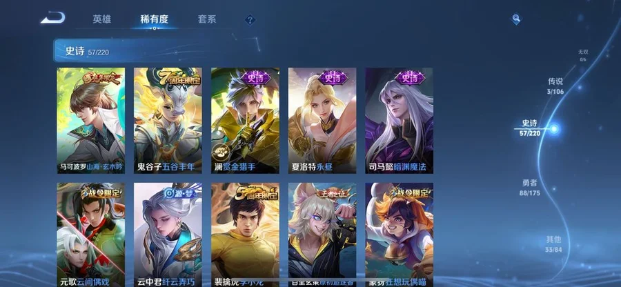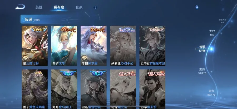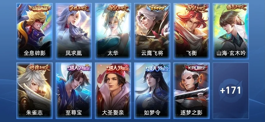 百里玄策-原初追逐者,馬可波羅-山海·玄木吟,鬼谷子-五穀豐年,元歌-雲間偶戲,雲中君-纖雲弄巧,蒙犽-狂想玩偶喵,裴擒虎-李小龍,馬可波羅-暗影遊獵,李元芳-銀河之約,妲己-時之彼端,后羿-如夢令,韓信-飛衡,蘭陵王-馴魔獵人,蔡文姬-繁星吟遊,上官婉兒-梁祝,魯班七號-獅舞東方,典韋-藍色畫面警告,裴擒虎-天狼狩獵者,嬴政-白晝王子,干將莫邪-冰霜戀舞曲,孫悟空-大聖娶親,百里守約-朱雀志,楊玉環-遇見飛天,花木蘭-青春決賽季,狄仁傑-魔術師,韓信-逐夢之影,趙雲-皇家上將,孫悟空-至尊寶