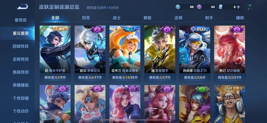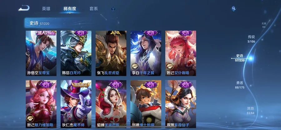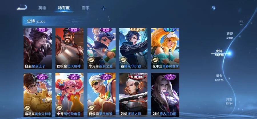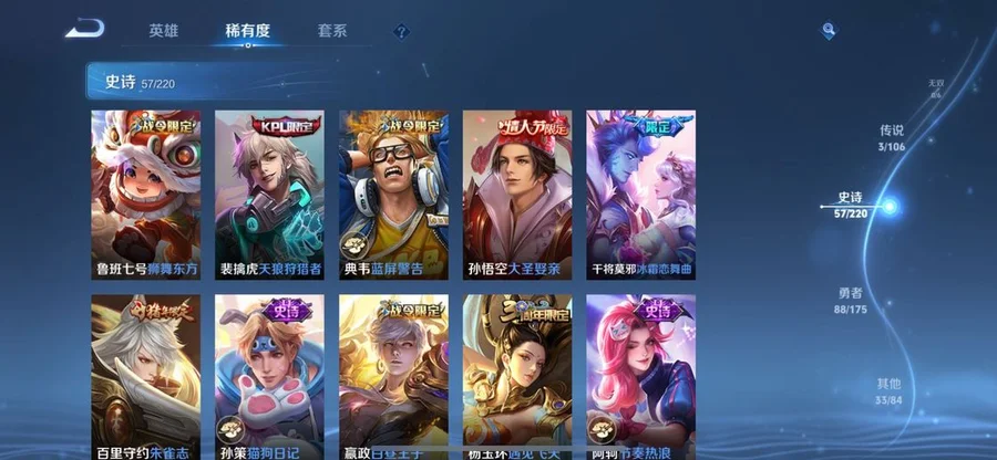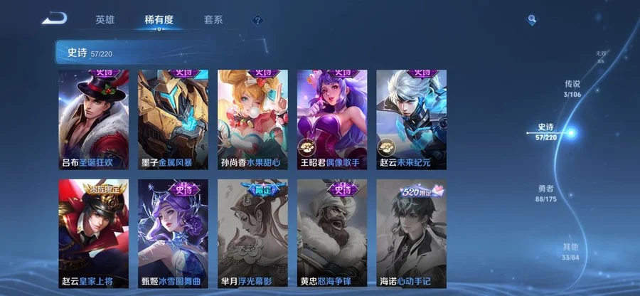劉禪-紳士熊喵,桑啟-畫中遊,張良-古海尋蹤,夏洛特-永晝,魯班七號-福祿兄弟,鍾無豔-聚星閃耀,亞連-破局者,豬八戒-潮玩探月行,大喬-守護之力,萊西奧-西部遊俠,宮本武藏-未來紀元,趙雲-未來紀元,呂布-聖誕狂歡,孫策-貓狗日記,安琪拉-玩偶對對碰,馬超-倖存者,瀾-賞金獵手,劉禪-秘密基地,司馬懿-暗淵魔法,妲己-女僕咖啡,姜子牙-熾熱元素使,花木蘭-兔女郎,蘇烈-堅韌之力,魯班大師-乓乓大師,雲纓-赤焰之纓,莊周-奇妙博物學,王昭君-偶像歌手,孫尚香-水果甜心,墨子-金屬風暴,楊戩-次元傲視,司空震-啟蟄,楊戩-埃及法老,瀾-孤獵,甄姬-冰雪圓舞曲,項羽-科學大爆炸,達摩-拳王,魯班大師-歸虛夢演,白起-星夜王子,蒙恬-秩序獵龍將,露娜-緋紅之刃,小喬-丁香結,夏侯惇-乘風破浪,盾山-圓桌騎士,曜-歸虛夢演,橘右京-修羅,鏡-冰刃幻境,盤古-創世神祝,劉備-紐約教父,貂蟬-聖誕戀歌,哪吒-次元突破,宮本武藏-霸王丸,達摩-大發明家,小喬-繽紛獨角獸,阿軻-節奏熱浪,諸葛亮-黃金分割率,魯班七號-黑桃隊長,鎧-曙光守護者,韓信-街頭霸王,雲中君-荷魯斯之眼,劉備-漢昭烈帝,劉邦-德古拉伯爵,王昭君-幻想奇妙夜,李白-範海辛,李元芳-逐浪之夏,貂蟬-異域舞娘,扁鵲-化身博士,韓信-白龍吟,沈夢溪-鯊炮海盜貓,甄姬-花好人間,小喬-萬聖前夜,狄仁傑-鷹眼統帥,程咬金-功夫廚神,呂布-野性能量,關羽-龍騰萬里,鎧-龍域領主,馬可波羅-激情綠茵,老夫子-功夫老勺,阿軻-愛心護理,張飛-亂世虎臣,張良-幽蘭居士,雅典娜-戰爭女神,李信-灼熱之刃,安琪拉-如懿,百里守約-絕影神槍,李元芳-特種部隊,韓信-教廷特使,孫尚香-沉穩之力,鬼谷子-幻樂之宴,孫策-海之征途,元歌-午夜歌劇院,牛魔-制霸全明星,明世隱-占星師,李白-千年之狐,夏侯惇-戰爭騎士,阿軻-致命風華,鍾無豔-海灘麗影,蘭陵王-隱刃,墨子-進擊墨子號,曹操-死神來了,大喬-伊勢巫女,露娜-紫霞仙子,諸葛亮-星航指揮官,宮本武藏-永珍初新,孫臏-未來旅行,黃忠-芝加哥教父,趙雲-忍·炎影,妲己-少女阿狸,妲己-魅力維加斯,亞瑟-死亡騎士