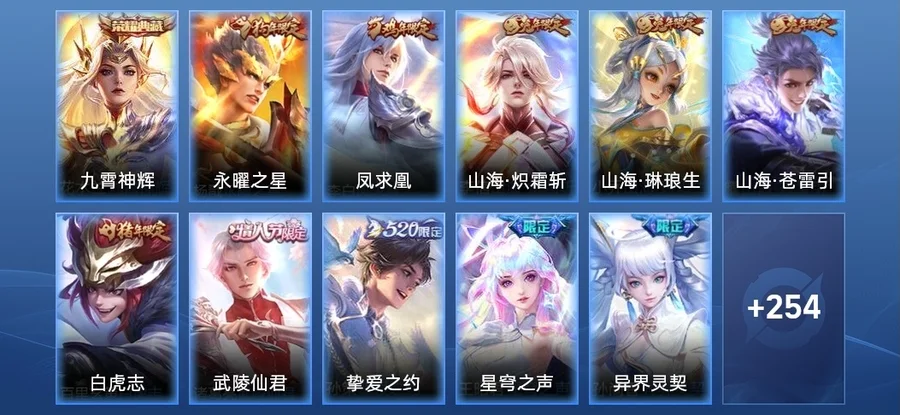 孫悟空-齊天大聖,小喬-山海·琳琅生,曜-山海·蒼雷引,李信-山海·熾霜斬,王昭君-星穹之聲,孫策-摯愛之約,孫尚香-異界靈契,虞姬-啟明星使,楊戩-永曜之星,李白-鳳求凰,百里玄策-白虎志,諸葛亮-武陵仙君