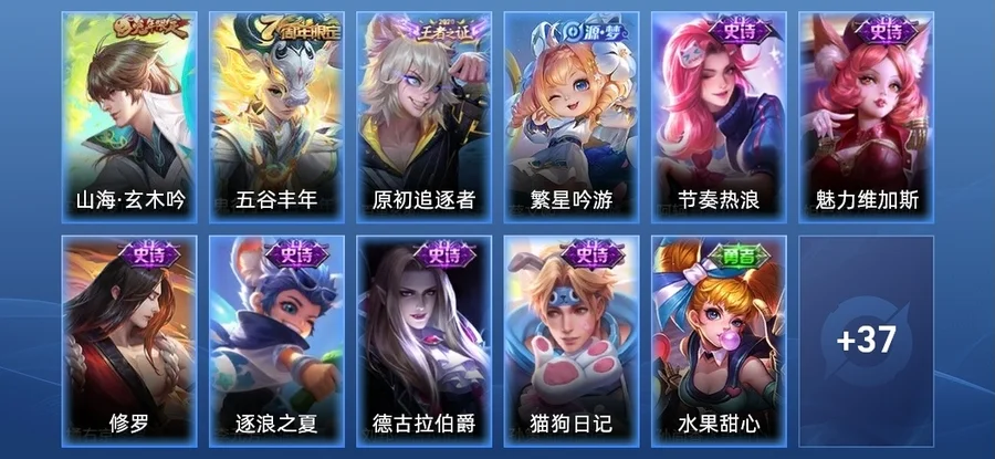 劉邦-德古拉伯爵,桑啟-畫中遊,雲纓-赤焰之纓,張良-古海尋蹤,蒙恬-蔚藍守將,白起-白色死神,司空震-啟蟄,牛魔-牛運亨通,孫策-貓狗日記,豬八戒-潮玩探月行,豬八戒-年年有餘,孫尚香-水果甜心,曜-歸虛夢演,百里玄策-威尼斯狂歡,橘右京-修羅,盾山-圓桌騎士,達摩-大發明家,魯班大師-乓乓大師,蒙犽-歸虛夢演,韓信-街頭霸王,露娜-哥特玫瑰,李元芳-逐浪之夏,盤古-重灌意志,阿軻-節奏熱浪,張良-繽紛繪卷,莊周-奇妙博物學,王昭君-幻想奇妙夜,宮本武藏-永珍初新,妲己-魅力維加斯,亞瑟-死亡騎士