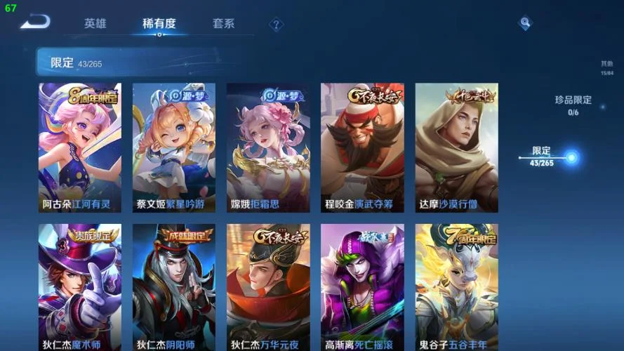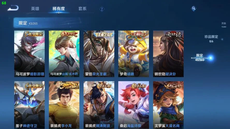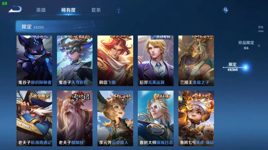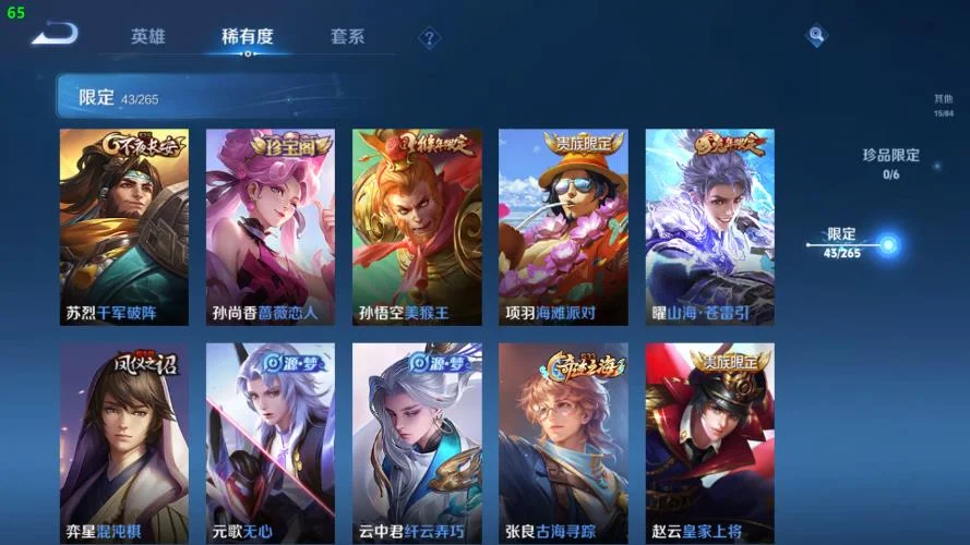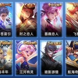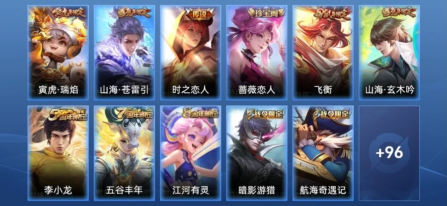劉禪-紳士熊喵,哪吒-次元突破,小喬-丁香結,甄姬-冰雪圓舞曲,安琪拉-心靈駭客,海月-王牌新星,張良-古海尋蹤,娜可露露-晚螢,韓信-教廷特使,蘭陵王-隱刃,公孫離-花間舞,孫悟空-西部大鏢客,夢奇-美夢成真,劉邦-聖殿之光,太乙真人-勁辣紅鍋,萊西奧-西部遊俠,孫尚香-時之戀人,牛魔-西部大鏢客,蒙恬-蔚藍守將,白起-白色死神,劉備-漢昭烈帝,嬴政-搖滾巨星,阿軻-節奏熱浪,貂蟬-異域舞娘,鍾無豔-海灘麗影,花木蘭-兔女郎,元歌-午夜歌劇院,哪吒-三太子,亞瑟-心靈戰警,橘右京-修羅,公孫離-無限星賞官,狄仁傑-鷹眼統帥,趙雲-忍·炎影,夏侯惇-乘風破浪,王昭君-偶像歌手,盤古-創世神祝,妲己-少女阿狸,瀾-孤獵,李信-灼熱之刃,蒙犽-歸虛夢演,瀾-賞金獵手,百里玄策-威尼斯狂歡,桑啟-畫中遊,宮本武藏-鬼劍武藏,百里守約-絕影神槍,盾山-圓桌騎士,孫尚香-沉穩之力,韓信-街頭霸王,劉備-萬事如意,魯班大師-乓乓大師,安琪拉-玩偶對對碰,蘭陵王-暗隱獵獸者,張飛-五福同心,大喬-守護之力,蘇烈-堅韌之力,程咬金-功夫廚神,張良-繽紛繪卷,呂布-聖誕狂歡,墨子-金屬風暴,呂布-野性能量,狂鐵-特工戰影