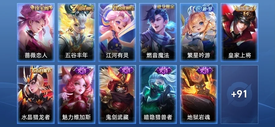 蔡文姬-繁星吟遊,趙雲-皇家上將,高漸離-燃音魔法,阿古朵-江河有靈,孫尚香-薔薇戀人,鬼谷子-五穀豐年