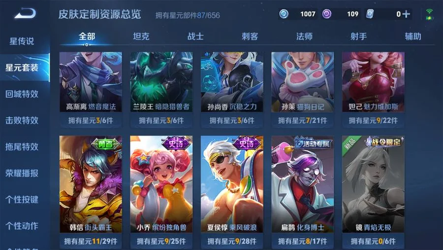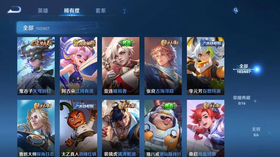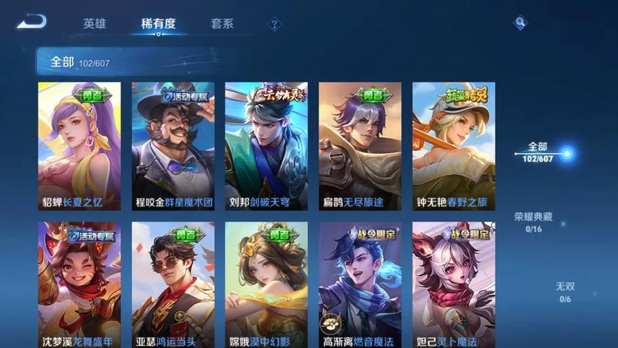 哪吒-次元突破,白起-白色死神,李元芳-妄想特派,瑤-森,蒙恬-秩序獵龍將,明世隱-占星師,夏侯惇-乘風破浪,虞姬-加勒比小姐,姜子牙-熾熱元素使,王昭君-幻想奇妙夜,鬼谷子-阿摩司公爵,成吉思汗-維京掠奪者,諸葛亮-掌控之力,鬼谷子-幻樂之宴,趙雲-忍·炎影,蘇烈-堅韌之力,李元芳-特種部隊,西施-歸虛夢演,雲纓-赤焰之纓,孫策-貓狗日記,高漸離-金屬狂潮,太乙真人-勁辣紅鍋,弈星-踏雪尋梅,花木蘭-水晶獵龍者,沈夢溪-鯊炮海盜貓,上官婉兒-修竹墨客,劉備-紐約教父,司馬懿-魘語軍師,甄姬-冰雪圓舞曲,東皇太一-東海龍王,魯班七號-木偶奇遇記,小喬-繽紛獨角獸,扁鵲-化身博士,明世隱-虹雲星官,亞連-破局者,瀾-孤獵,張良-古海尋蹤,李白-範海辛,廉頗-地獄巖魂,狂鐵-特工戰影,韓信-街頭霸王,豬八戒-潮玩探月行,呂布-野性能量,關羽-天啟騎士,諸葛亮-星航指揮官,蘭陵王-暗隱獵獸者,項羽-帝國元帥,伽羅-花見巫女,宮本武藏-永珍初新,戈婭-危途狂花,小喬-萬聖前夜,宮本武藏-鬼劍武藏,達摩-大發明家,程咬金-無雙福將,馬可波羅-激情綠茵,李信-灼熱之刃,貂蟬-異域舞娘,劉禪-喚靈魔甲,百里守約-絕影神槍,孫悟空-西部大鏢客,韓信-教廷特使,干將莫邪-第七人偶,孫尚香-沉穩之力,露娜-緋紅之刃,黃忠-芝加哥教父,孫尚香-水果甜心,楊玉環-霓裳曲,花木蘭-兔女郎,宮本武藏-霸王丸,后羿-精靈王,盾山-圓桌騎士,妲己-魅力維加斯,亞瑟-死亡騎士