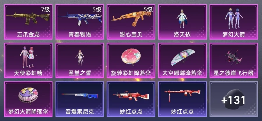 AKM-甜心寶貝,SCAR-L-青春物語,M416-五爪金龍,AKM-百萬伏特,AKM-星之彼岸,AKM-萌趣顏糰子,M16A4-甜心亞夢,SCAR-L-龍宮之主,SCAR-L-甜蜜誓約,GROZA-影襲,GROZA-懵萌河馬,GROZA-異彩先驅,GROZA-治癒之星,AUG-青春冒險家,AUG-炫光貝貝,AUG-耀粉歌者,AUG-閒夢青纓,QBZ-飛馳魅影,M762-詭娃娃,M762-瑞龍福將,Mk47-妙紅點點,Mk47-青春冒險家,G36C-時空追擊者,G36C-懵萌河馬,AC-VAL-甜心亞夢,AC-VAL-快閃甜心,蜜獾-嬌憨豬豬,蜜獾-垂柳戲鴨,Kar98K-夢幻火箭,Kar98K-影襲,Kar98K-2B戰鬥服款,Kar98K-飛馳魅影,M24-影襲,M24-治癒之星,AWM-音爆索尼克,AWM-激戰未來,Win94-瑞龍福將,莫辛納甘-懵萌河馬,AMR-妙紅點點,AMR-妙趣可麗,M200-驚鴻俠骨,SKS-時空追擊者,Mini14-築夢精靈,Mini14-穿刺龍蝦,Mini14-夢幻火箭,Mini14-異彩先驅,Mk14-治癒之星,Mk14-豬豬俠,SLR-嬌憨豬豬,QBU-青春冒險家,QBU-錦繡火鯉,QBU-烈焰拳霸,M417-驚鴻俠骨,MK20-H-快閃甜心,UZI-影襲,UZI-嬌憨豬豬,UMP45-詭娃娃,UMP45-時空追擊者,Vector-治癒之星,湯姆遜-異彩先驅,野牛-青春冒險家,MP5K-異彩先驅,P90-飛馳魅影,P90-快閃甜心,S686-橘柚傾心,S1897-飛馳魅影,S1897-碧影閃光,S12K-嬌憨豬豬,S12K-垂柳戲鴨,S12K-瑞龍福將,DBS-甜心亞夢,DBS-時空追擊者,AA12-G-萌物絨絨,M249-百萬伏特,M249-妙紅點點,DP-28-原初聖火,DP-28-甜心亞夢,MG3-驚鴻俠骨,MG3-妙紅點點,MG3-瑞龍福將,PKM-懵萌河馬