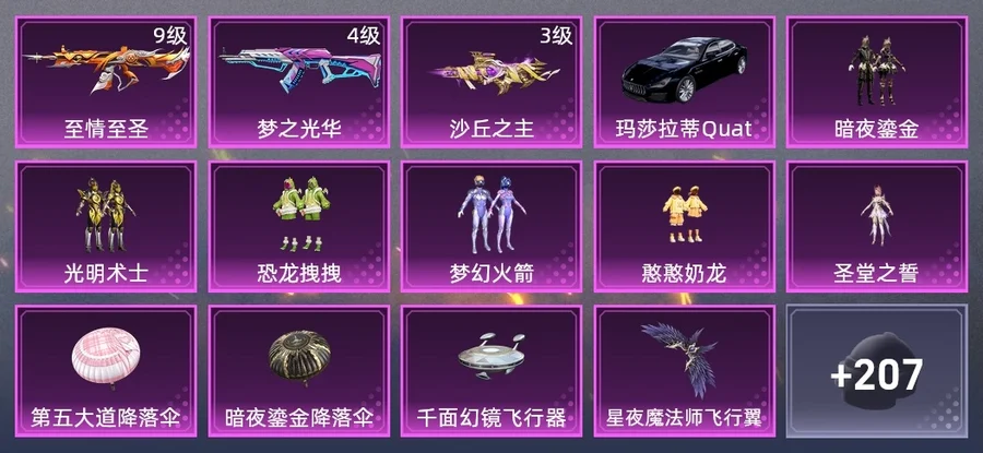 深海曼妙降落傘,甜心首席降落傘,神秘黑貓降落傘,聖堂之誓降落傘,百萬伏特降落傘,第五大道降落傘,沙丘之主降落傘,暗夜鎏金降落傘,星之彼岸降落傘,星夜魔法師飛行翼,千面幻鏡飛行器,黃族統領飛行器,勇闖險境飛行服,夢幻火箭飛行器
