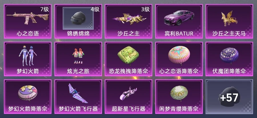 SCAR-L-錦繡綿綿,M416-心之戀語,P90-沙丘之主,GROZA-恐龍拽拽,GROZA-懵萌河馬,GROZA-治癒之星,AUG-耀粉歌者,QBZ-未來歌姬,QBZ-原初聖火,G36C-懵萌河馬,G36C-鏡域雙華,Famas-鏡域雙華,Kar98K-夢幻火箭,M24-治癒之星,AWM-焰鷹斗篷,AWM-恐龍拽拽,莫辛納甘-懵萌河馬,M200-驚鴻俠骨,Mini14-夢幻火箭,Mini14-原初聖火,M417-驚鴻俠骨,Vector-治癒之星,Vector-焰鷹斗篷,野牛-沙丘之主,S12K-香水檸檬,DBS-焰鷹斗篷,M249-沙丘之主,DP-28-原初聖火,DP-28-焰鷹斗篷,MG3-驚鴻俠骨,PKM-懵萌河馬