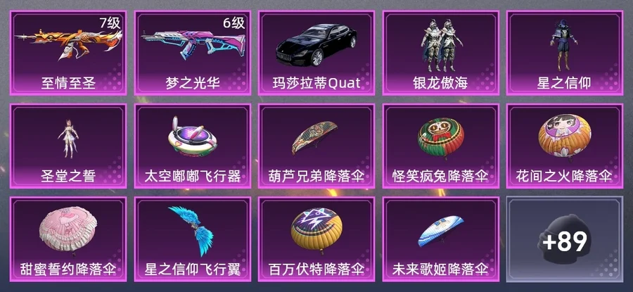 百萬伏特降落傘,未來歌姬降落傘,怪笑瘋兔降落傘,閒夢青纓降落傘,花間之火降落傘,甜蜜誓約降落傘,葫蘆兄弟降落傘,太空嘟嘟飛行器,星之信仰飛行翼