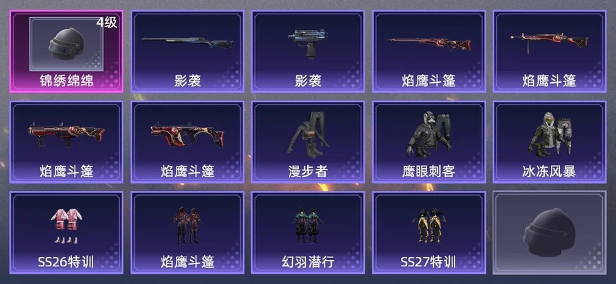 SCAR-L-錦繡綿綿,M24-影襲,AWM-焰鷹斗篷,UZI-影襲,Vector-焰鷹斗篷,DBS-焰鷹斗篷,DP-28-焰鷹斗篷