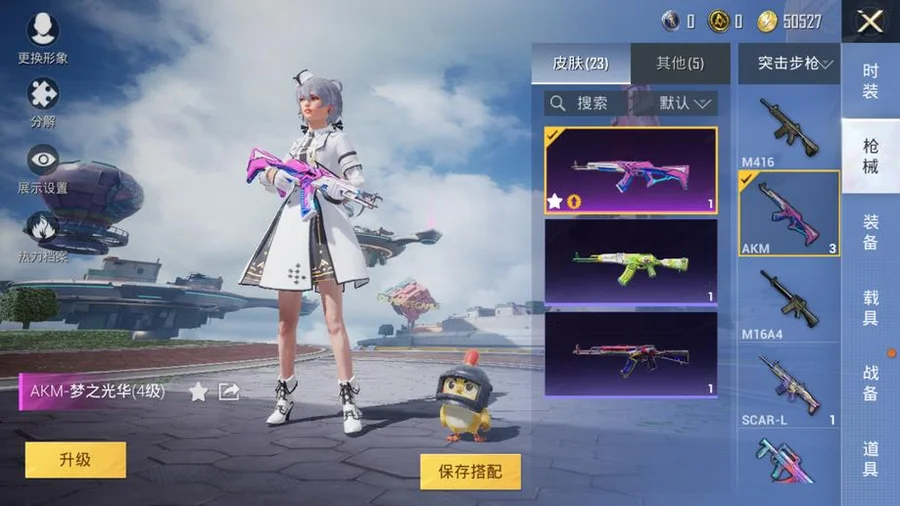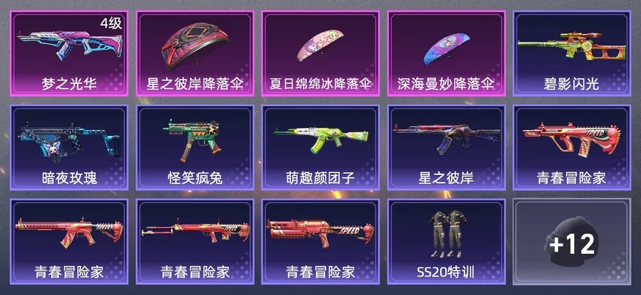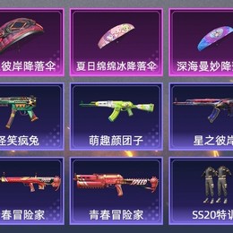 AKM-星之彼岸,Mk47-青春冒險家,AUG-青春冒險家,AKM-萌趣顏糰子,QBU-青春冒險家,VSS-碧影閃光,野牛-青春冒險家,Vector-暗夜玫瑰,MP5K-怪笑瘋兔,AKM-夢之光華