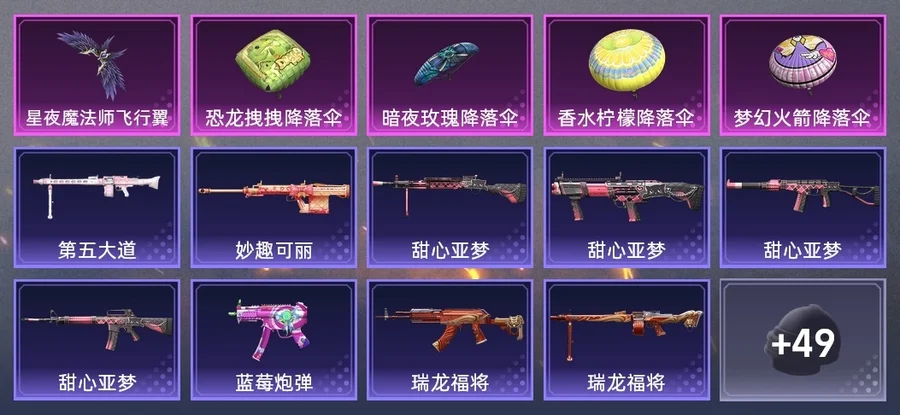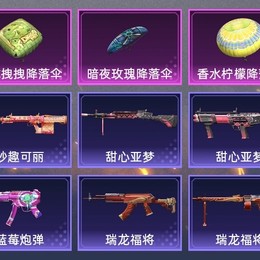 M16A4-甜心亞夢,GROZA-治癒之星,AUG-耀粉歌者,M762-拳皇97,M762-瑞龍福將,AC-VAL-甜心亞夢,Kar98K-終極賽羅,Kar98K-深海曼妙,M24-奇異狩獵者,M24-治癒之星,Win94-瑞龍福將,AMR-妙趣可麗,SKS-迅猛狂鯊,Mini14-穿刺龍蝦,Mk14-治癒之星,QBU-颯粉甜心,UMP45-詭娃娃,Vector-治癒之星,湯姆遜-耀粉歌者,MP5K-藍莓炮彈,S12K-瑞龍福將,DBS-甜心亞夢,M249-拳皇97,DP-28-甜心亞夢,MG3-瑞龍福將,MG3-第五大道