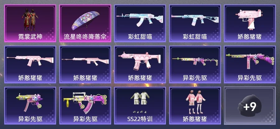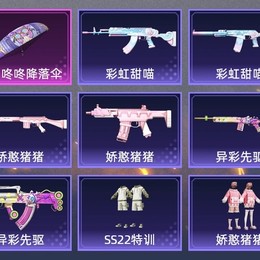 GROZA-異彩先驅,M762-彩虹甜喵,AC-VAL-彩虹甜喵,蜜獾-嬌憨豬豬,Mini14-異彩先驅,SLR-嬌憨豬豬,UZI-嬌憨豬豬,湯姆遜-異彩先驅,MP5K-異彩先驅,S12K-嬌憨豬豬