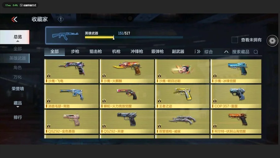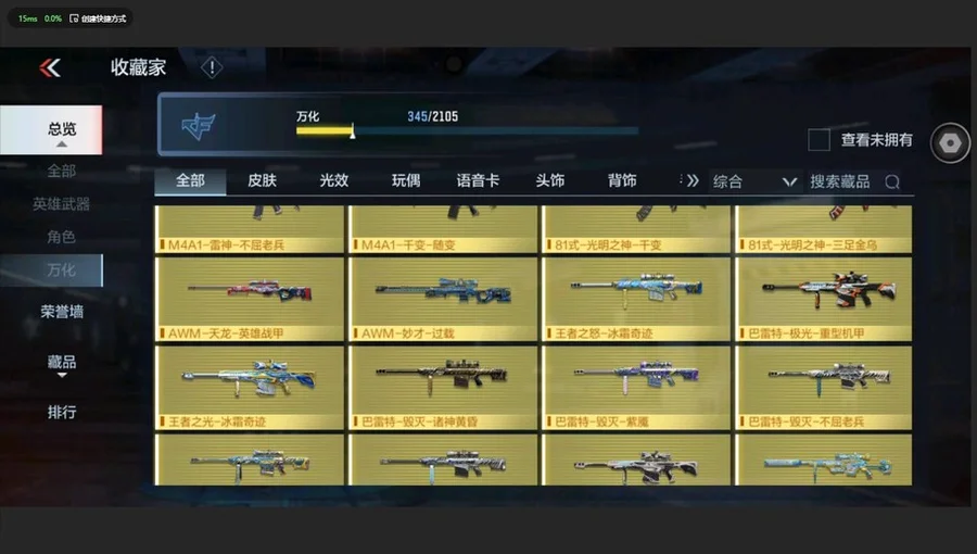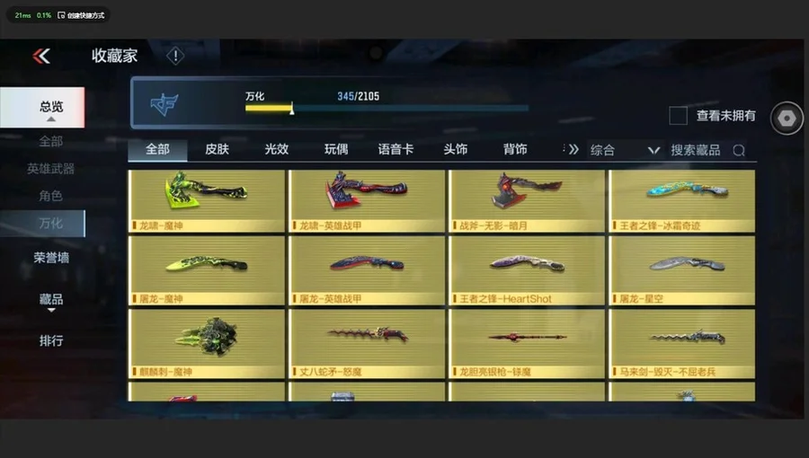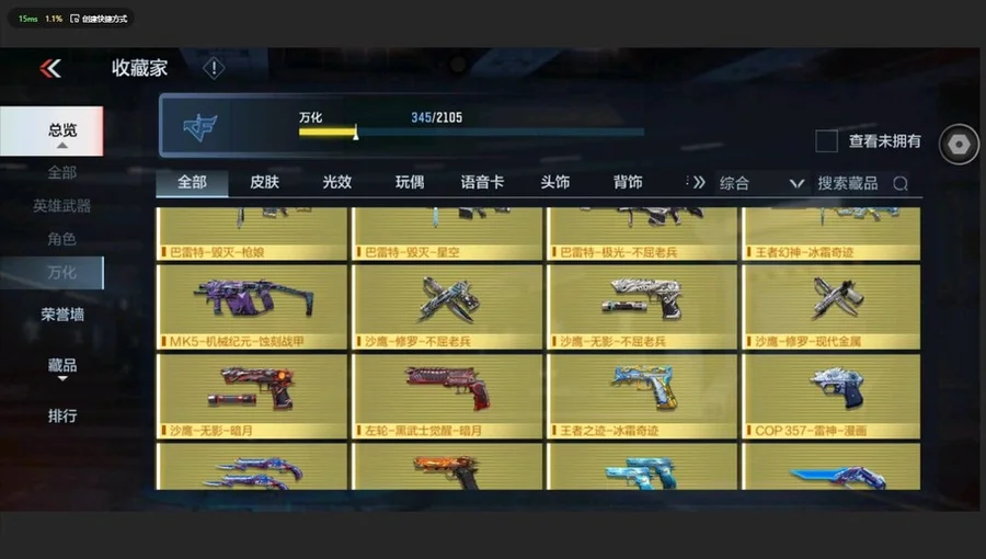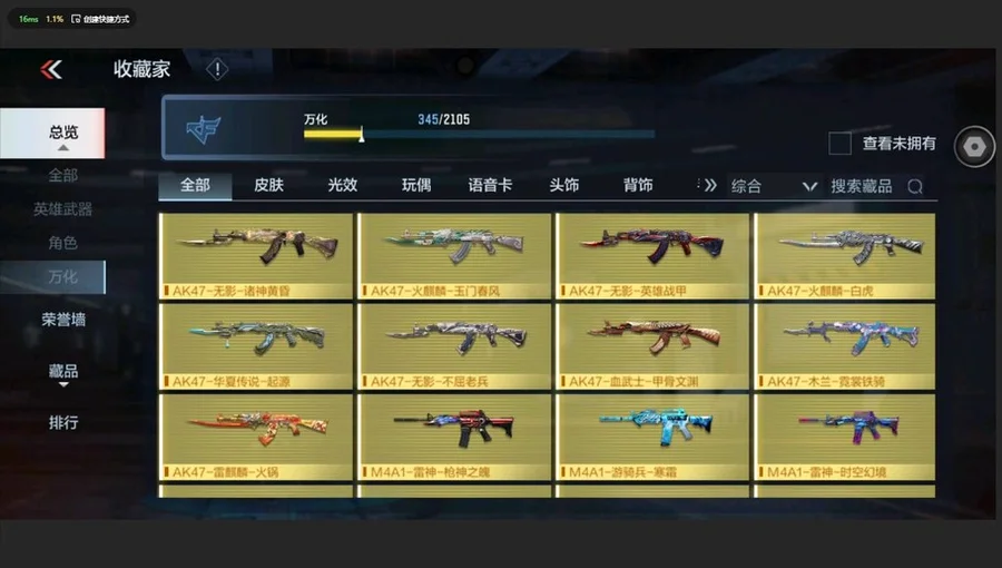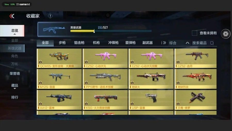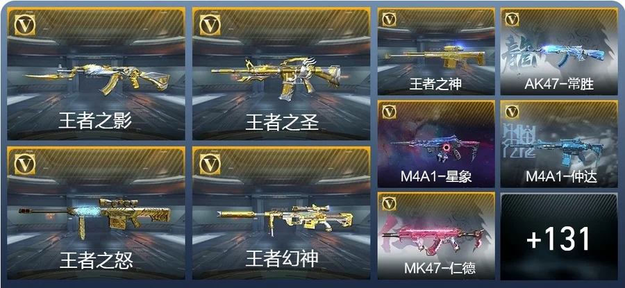 AK47-常勝,M4A1-仲達,M4A1-星象,MK47-仁德,M200-幻神,81式-光明之神,MR1-龍吟驚滄海,COP 357-雷霆,AK47-無影,AK47-雷暴,AK47-無影-葵,M4A1-雷神-蘿拉,M4A1-死神,M4A1-黑騎士,M4A1-遊騎兵,M4A1-雷神,AK47-木蘭,M4A1-機械迷城,M4A1-黑龍鈺-子涵,M4A1-雷霆,巴雷特-毀滅,巴雷特-金色薔薇,巴雷特-極光,巴雷特-雷霆,G36-機械紀元,AUG-機械紀元,09式狙-幻獸,TAC-天使,劉易斯-天使,MK5-極光,雙持斯泰爾-天使,M12S-雷霆,AA12-雷神,AK47-Rush-星速,AK47-角鬥士,AK47-華夏傳說,AK47-血武士,AK47-心動次元覺醒,AK47-幸運日,AK47-黑鯊,M4A1-玫瑰精靈,M4A1-Rush-夜襲,M4A1-龍血,M4A1-心動次元覺醒,M4A1-千變,M4A1-破空冰刃,M4A1-運輸船,M4A1-海騎士,巴雷特-坦克堡壘,巴雷特-冬滅,SCAR-探星者,鐳射毀滅者Ⅲ,SCAR-幽暗騎士,9A91-天神,AWM-裁決,98K-血月,M200-心動次元覺醒,GM6-戰爭風雲覺醒,加特林-堡壘覺醒,湯姆遜-烈龍,加特林-堡壘,RPK-赤炎盤龍,QCW05-未來戰士,地獄火,地獄烈炎,KSG-火力競放覺醒,CZS2-心動次元覺醒,CZS2-心動次元,雙管獵槍-威侯,消音毛瑟-常勝,MK23-幻神,MK23-瑜,墨刃-幻神,丈八蛇矛,沙鷹-修羅,USP-雷暴,沙鷹-冰鋒覺醒,QSZ92-金色薔薇,沙鷹-火麒麟,沙鷹-明目達聰,QSZ92-天使,MK23-機械紀元,尼泊爾-機械紀元,擎天,馬來劍-毀滅,斬神刀-雷暴,尼泊爾-雷霆,沙鷹-飛電,蟒蛇-火力競放覺醒,神罰戰斧,血月,龍嘯,屠龍,血陽,唐刀-大唐榮耀,麒麟刺,耀金雷刃,唐刀-華夏傳說,叢林匕首-火力競放覺醒,星芒,高爆手雷-墮天神,閃光彈-墮天神,高爆手雷-雷暴,煙霧彈-雷暴,閃光彈-雷暴,高爆手雷-雷霆,煙霧彈-雷霆,閃光彈-雷霆,黑騎士手雷,火麒麟手雷,火麒麟煙霧彈,機械紀元手雷,機械紀元煙霧彈,燃燒彈-遊騎兵,煙霧彈-遊騎兵