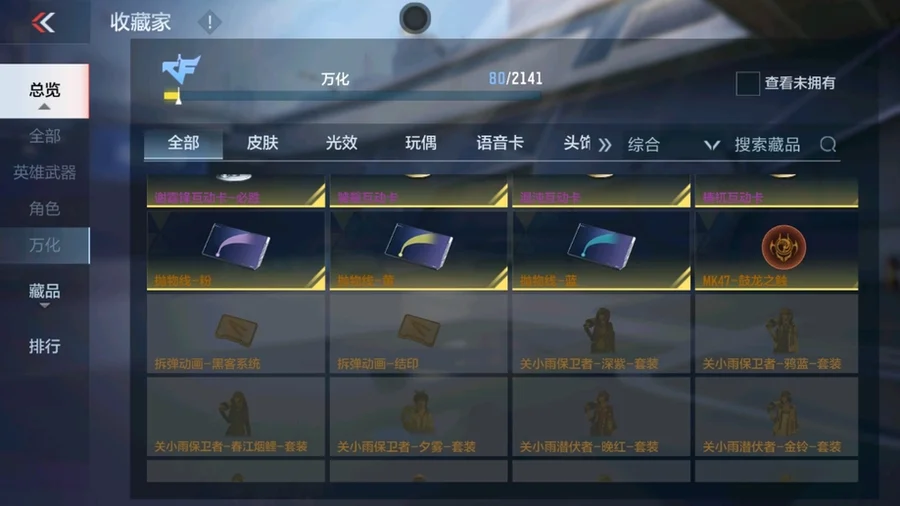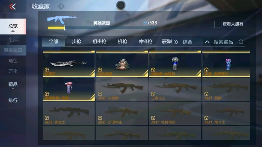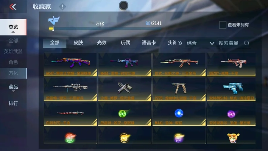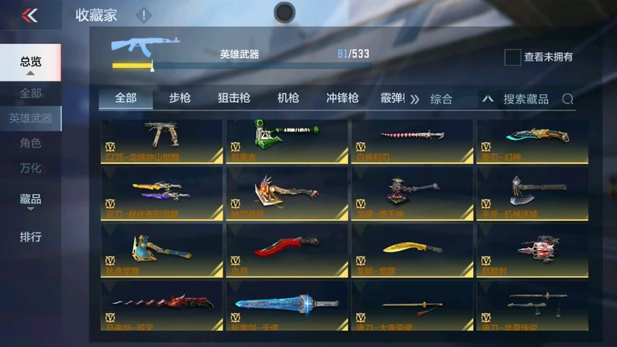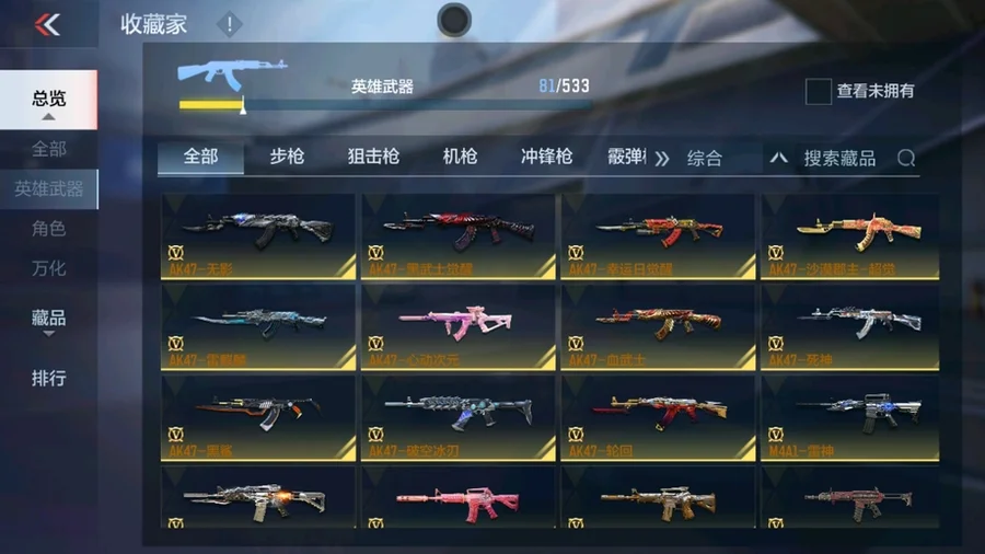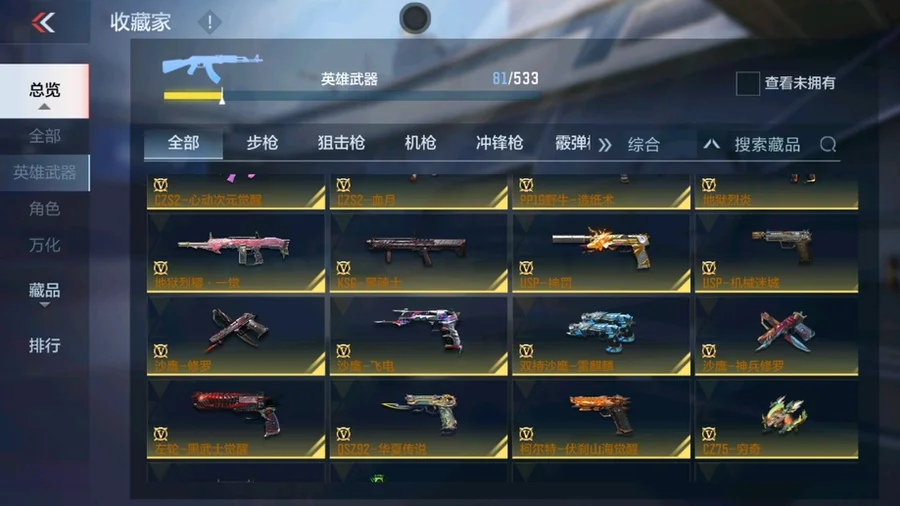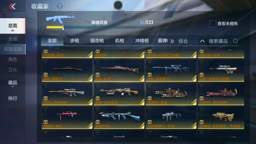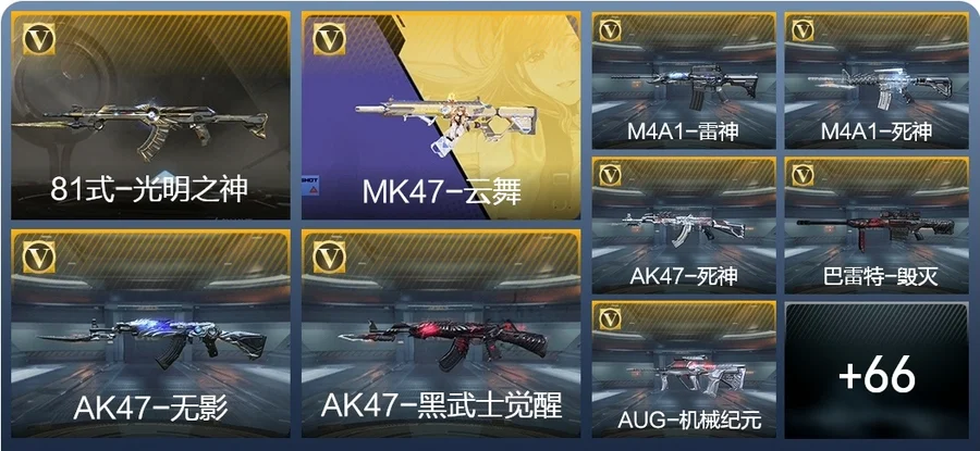 81式-光明之神,M4A1-死神,巴雷特-毀滅,AK47-黑武士覺醒,M4A1-雷神,AK47-無影,AK47-死神,AUG-機械紀元,QBZ03-死神,98K-黑騎士,雙持斯泰爾-天使,M4A1-獵神,M4A1-心動次元,AK47-血武士,AK47-幸運日覺醒,AK47-雷麒麟,AK47-黑鯊,AK47-沙漠郡主-超覺,AK47-心動次元,9A91-天神,M14EBR-暗夜覺醒,劍齒虎-炫彩,M200-心動次元覺醒,GM6-戰爭風雲覺醒,暗殺神,09式狙-天神,SR25-燃燒泰坦,98K-血月,RPK-赤炎盤龍,加特林-堡壘,加特林-堡壘覺醒,寒霜烈龍,CZS2-心動次元覺醒,地獄烈櫻·一覺,地獄烈炎,白骨利刃,墨刃-幻神,USP-機械迷城,沙鷹-修羅,左輪-黑武士覺醒,龍嘯-墮天神,手斧-機械迷城,USP-神罰,沙鷹-飛電,斬魔刀,麒麟刺,神罰戰斧,血月,弒魔者,燃燒彈-遊騎兵,手雷-競界榮光,MK47-雲舞