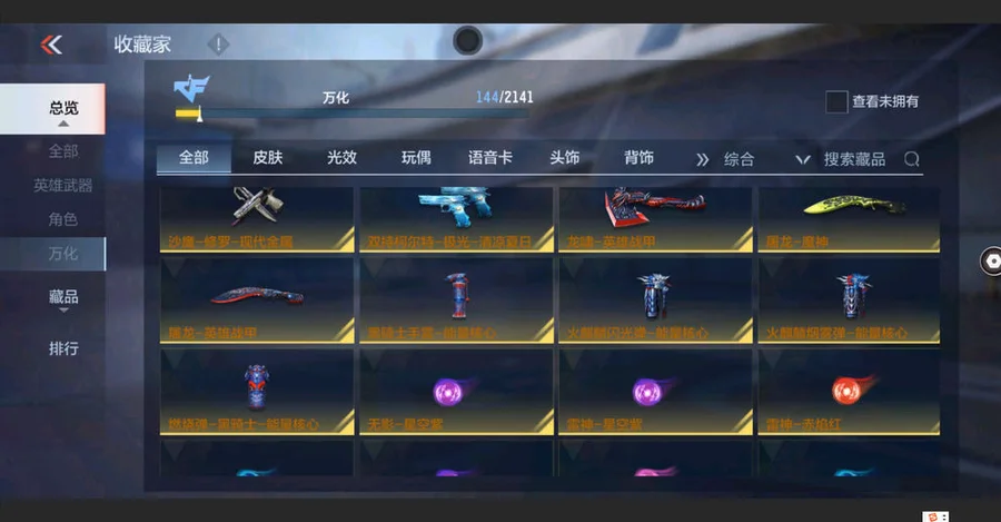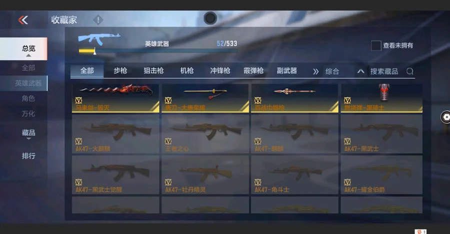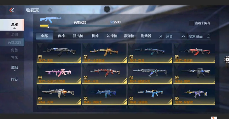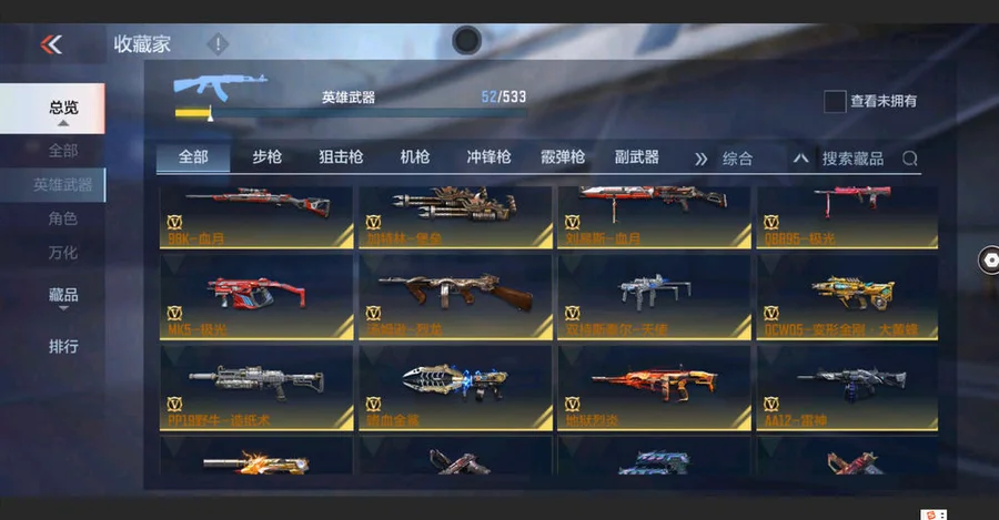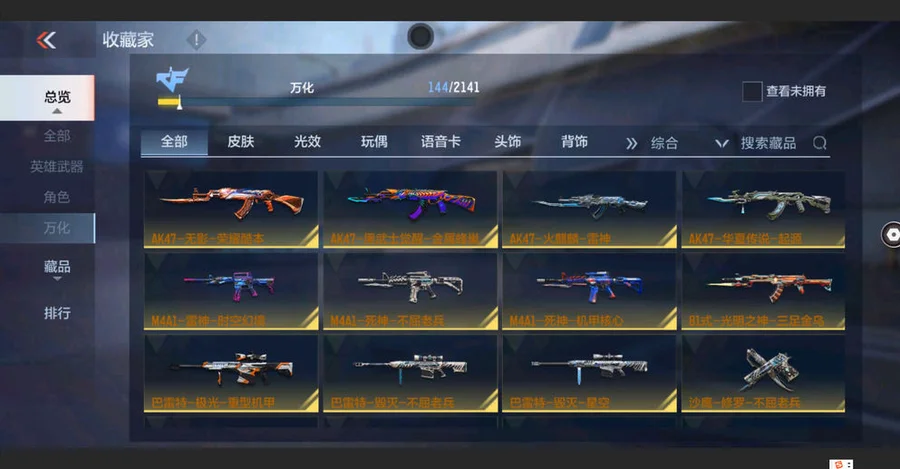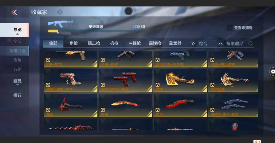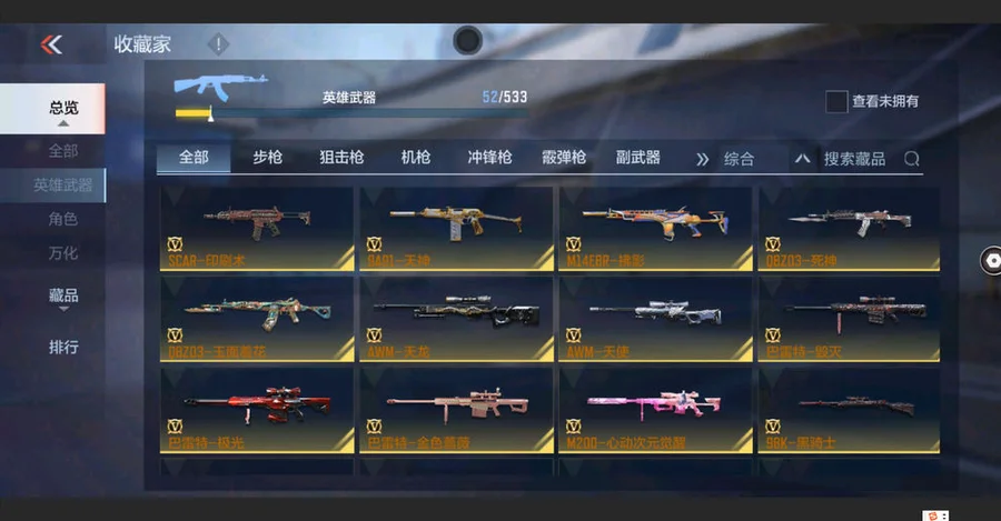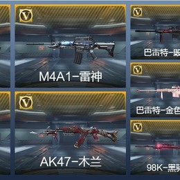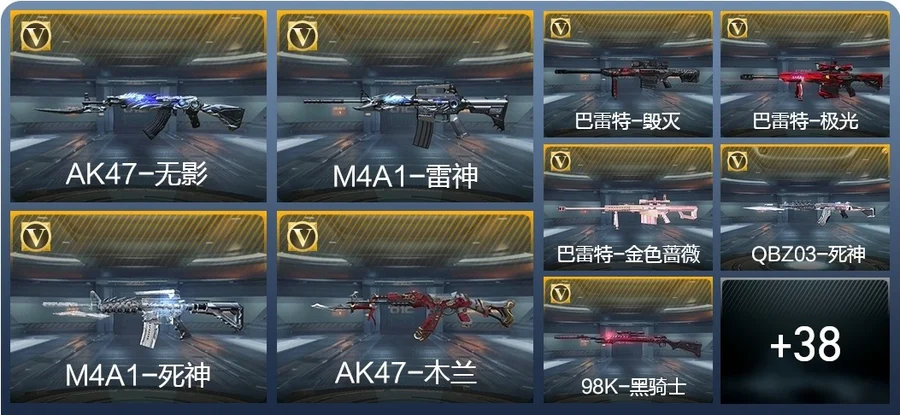 巴雷特-毀滅,巴雷特-金色薔薇,巴雷特-極光,M4A1-死神,AK47-木蘭,AK47-無影,M4A1-雷神,AWM-天使,QBZ03-死神,98K-黑騎士,MK5-極光,雙持斯泰爾-天使,AA12-雷神,M4A1-運輸船,AK47-沙漠領主,AK47-亞龍,AK47-幸運日,M4A1-海騎士,AK47-心動次元覺醒,98K-血月,9A91-天神,M200-心動次元覺醒,AWM-天龍,SCAR-探星者,嗜血金鯊,地獄烈炎,加特林-堡壘,劉易斯-血月,雙持柯爾特-極光,雙持沙鷹-變色龍,馬來劍-毀滅,百戰巾幗槍,USP-神罰,神罰戰斧,龍嘯,屠龍,雙持尼泊爾-亞龍,血月,血陽,唐刀-大唐榮耀