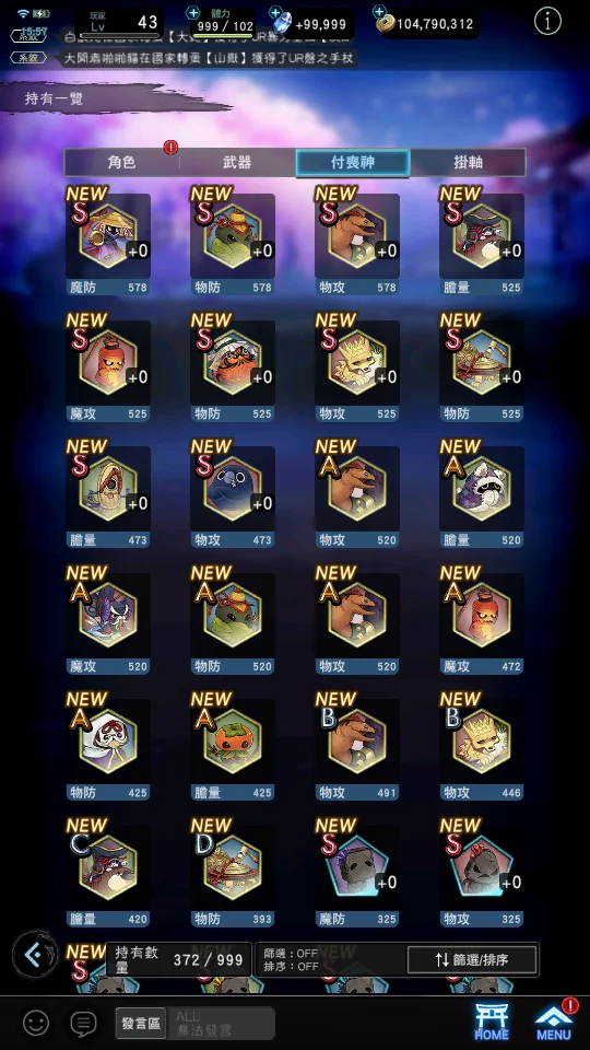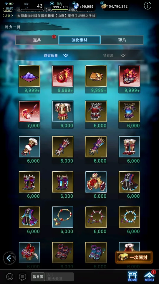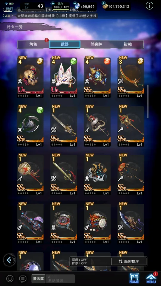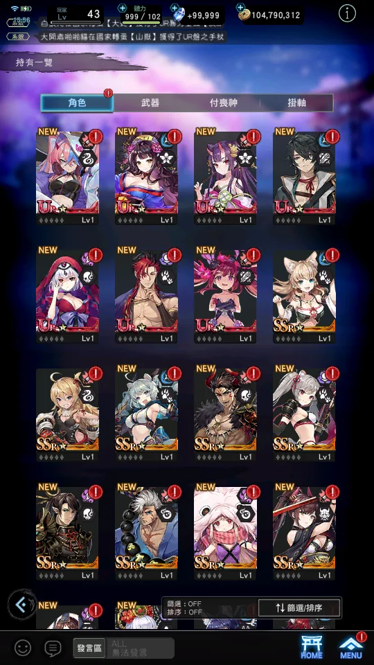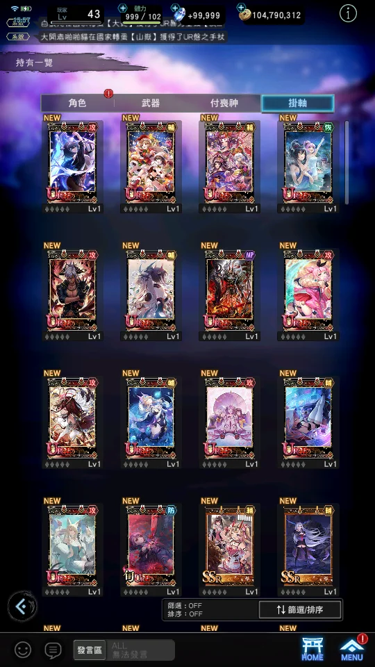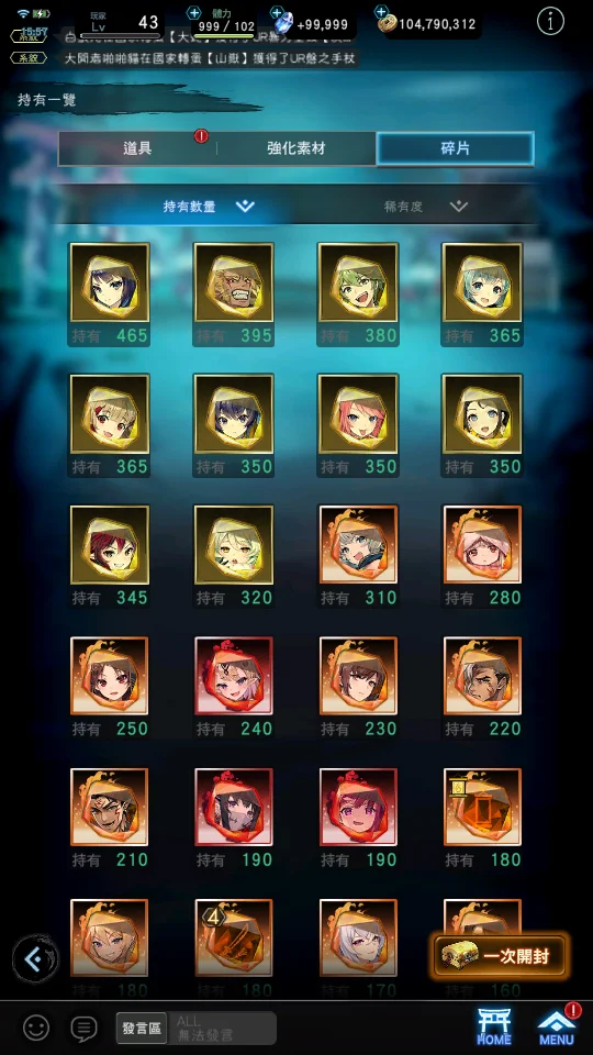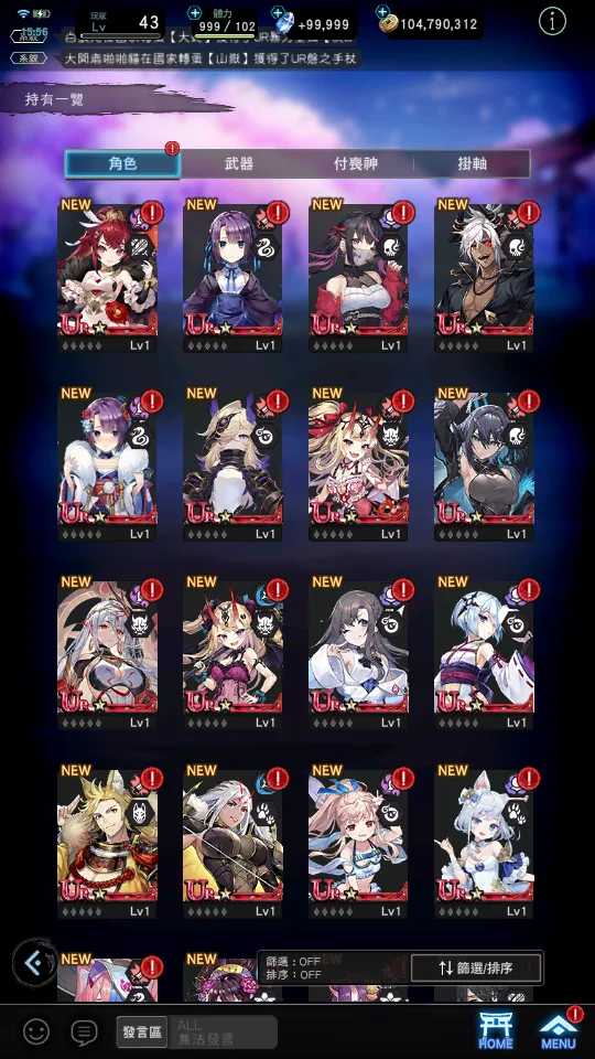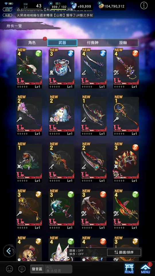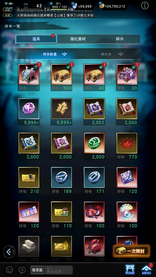 【道具】武器掛軸單抽轉蛋券X210、角色單抽轉蛋券X110、UR武器隨機禮盒X1、157996鑽,800T