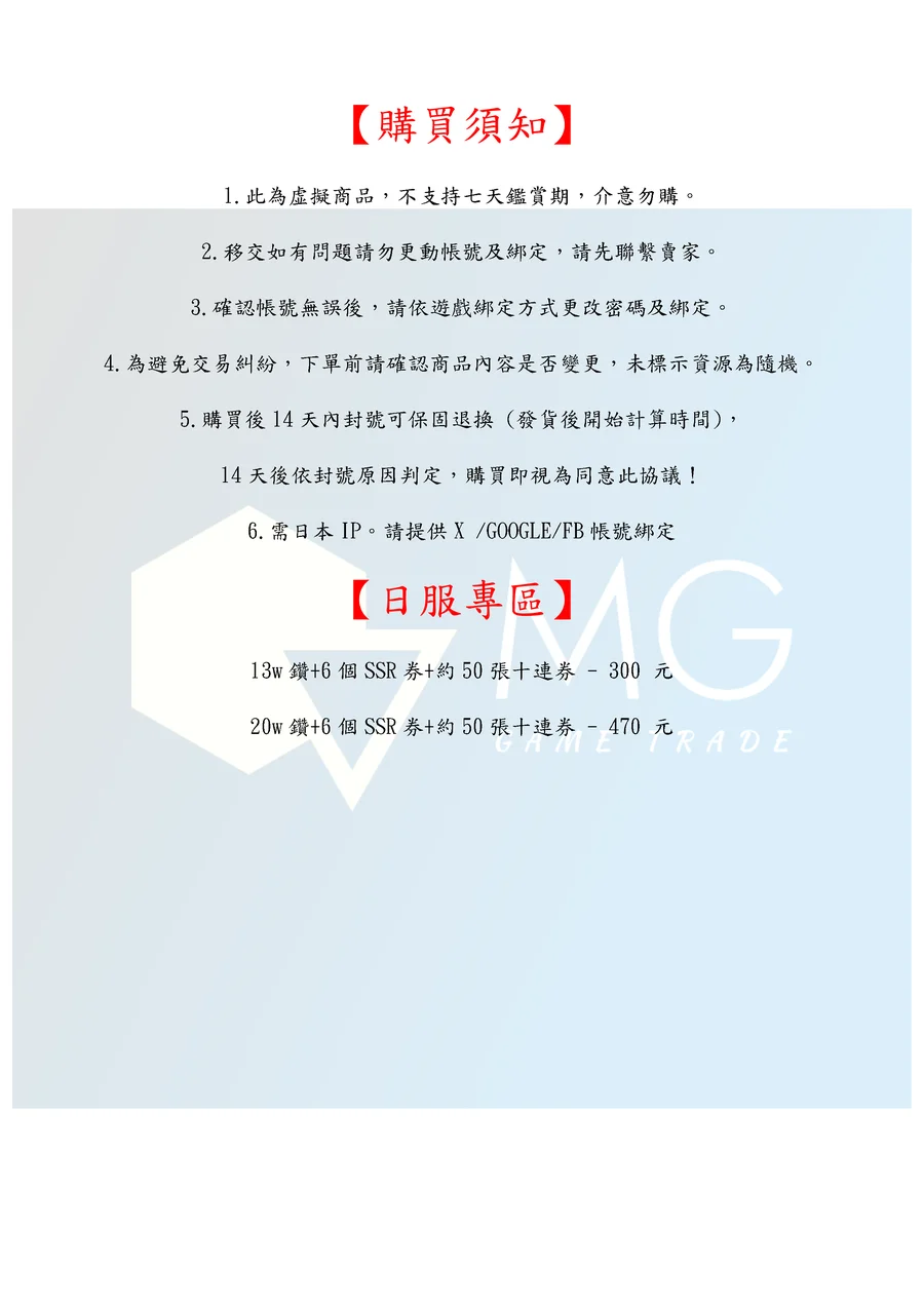 6.需日本IP。下單後請提供X /GOOGLE/FB帳號綁定