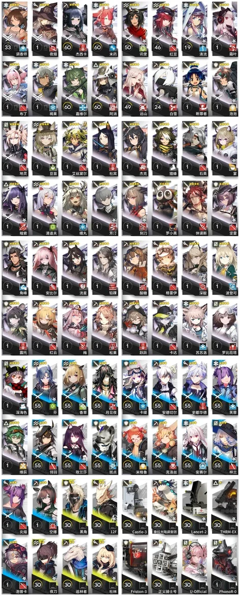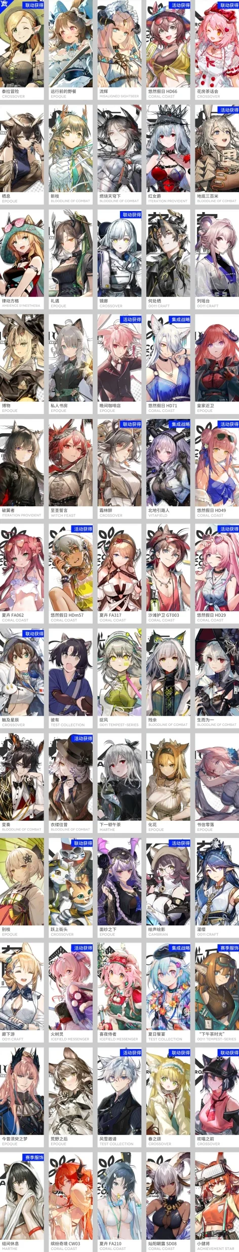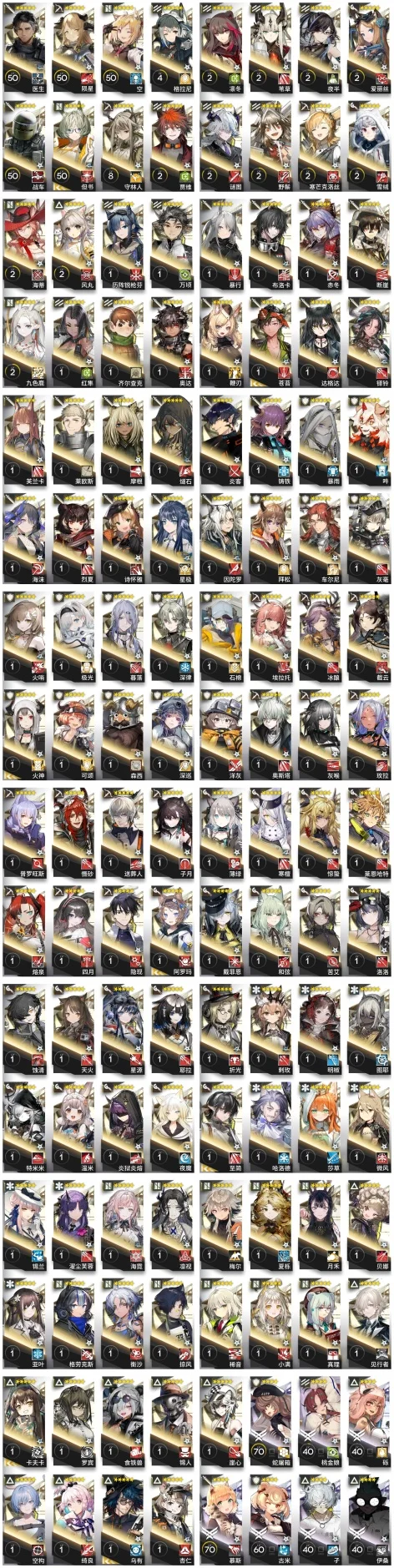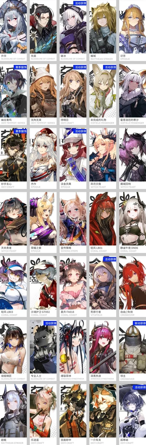 森蚺,霍爾海雅,焰影葦草,史爾特爾,安潔莉娜,鐧,塞雷婭,重嶽,夜鶯,夕,歸溟幽靈鯊,林,鴻雪,凱爾希,塑心,瑕光,仇白,伊芙利特,靈知,風笛,鈴蘭,薇薇安娜,琳琅詩懷雅,赫拉格,銀灰,佩佩,假日威龍陳,伺夜,迷迭香,號角,琴柳,淬羽赫默,帕拉斯,斯卡蒂,刻俄柏,緘默德克薩斯,歌蕾蒂婭,阿,多蘿西,麥哲倫,星熊,陳,卡涅利安,煌,艾雅法拉,黑,嵯峨,老鯉,耀騎士臨光,W,水月,閃靈,能天使,推進之王,流明,純燼艾雅法拉,空弦,莫斯提馬,令,早露,聖約送葬人,澄閃,娜仁圖亞,泥岩,白鐵,異客,提豐,遠牙,止頌,黑鍵,棘刺,伊內絲,山,灰燼,濁心斯卡蒂,溫蒂,年,繆爾賽思,菲亞梅塔,傀影,麒麟R夜刀,瑪恩納,艾麗妮,百鍊嘉維爾