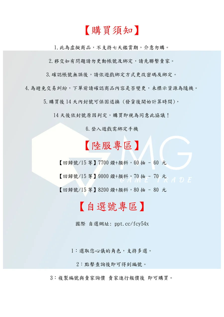 3.交易時確認帳號資源無誤後,切記依照遊戲綁定方式更改密碼以及綁定。