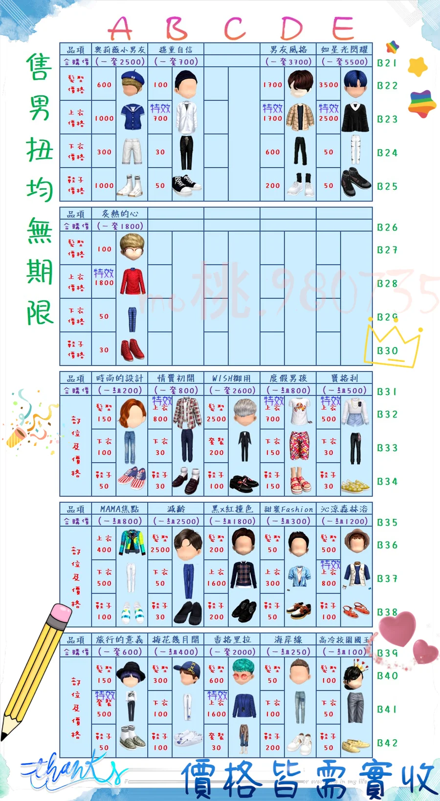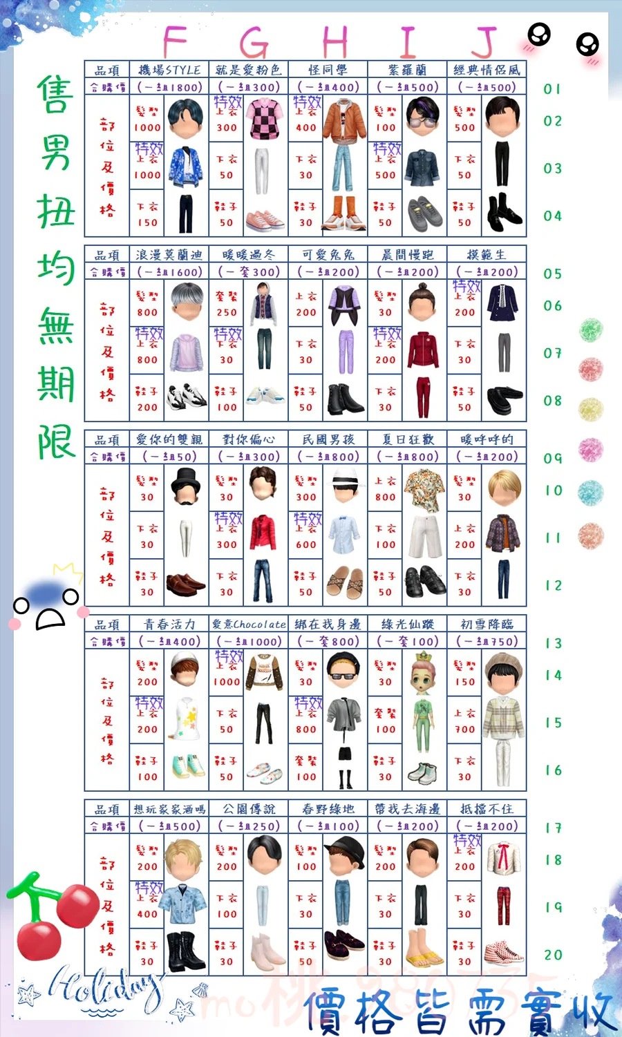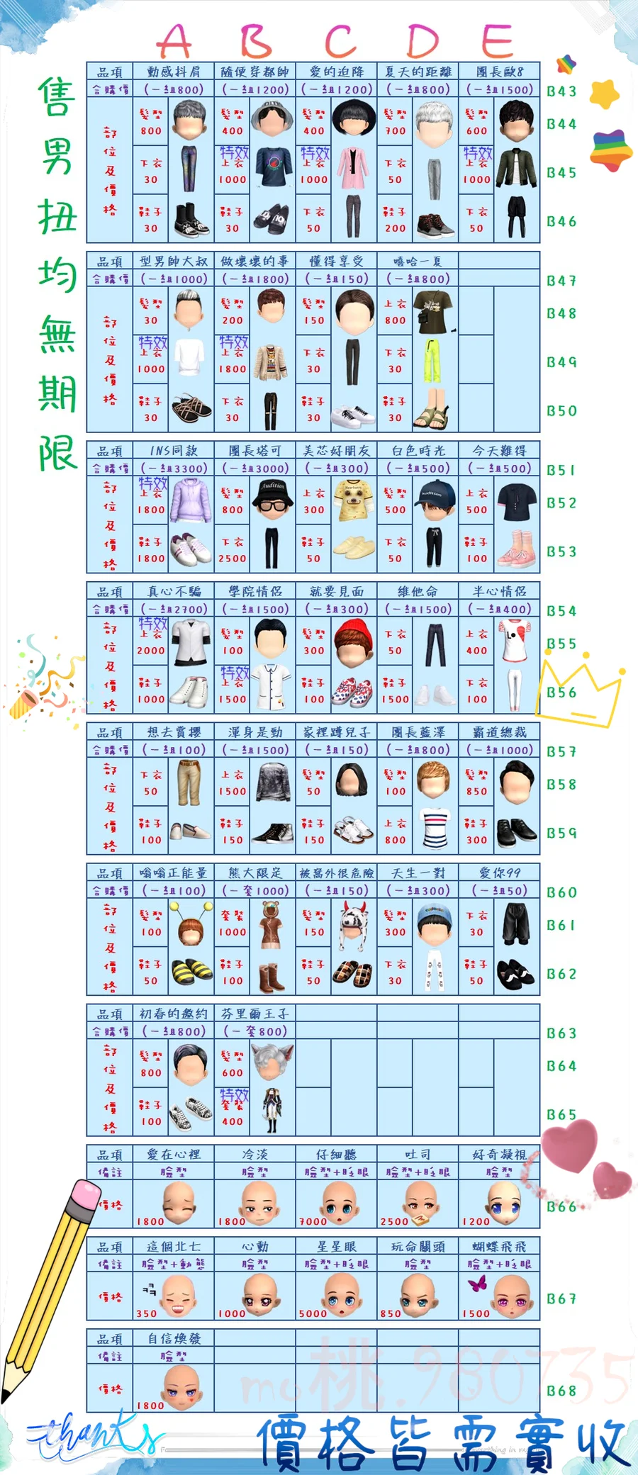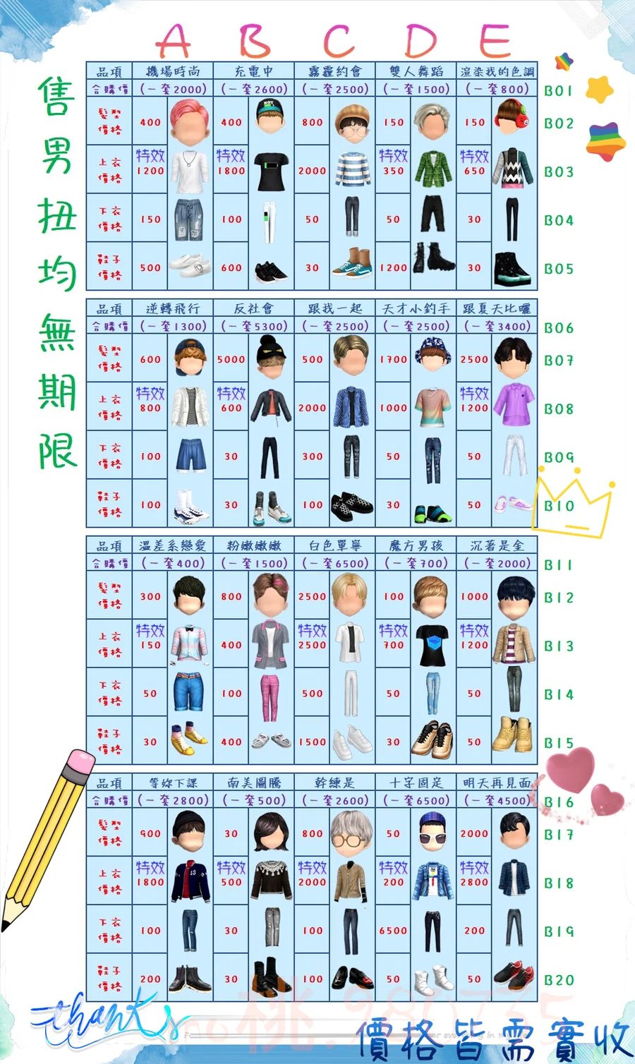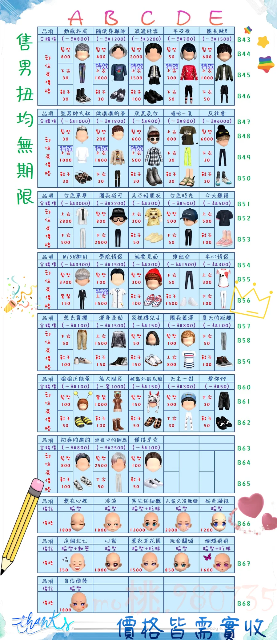 價格都是需要實收,另請先告知男生還女生的在附上編號!