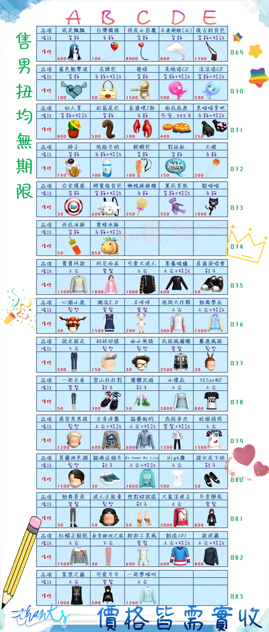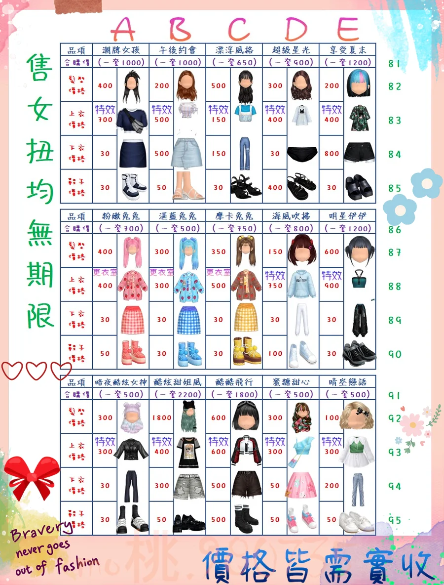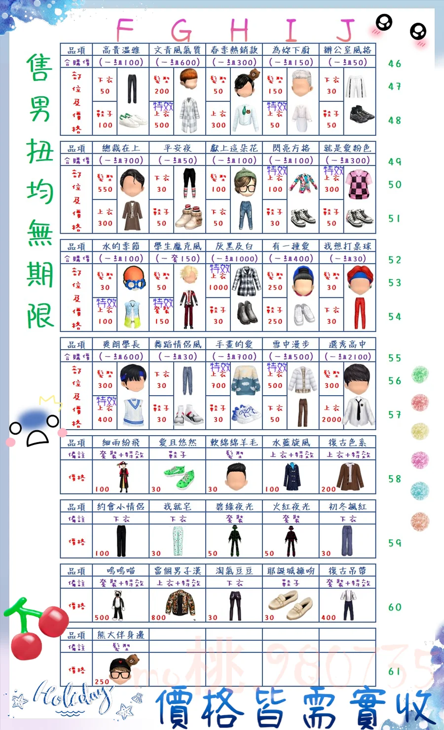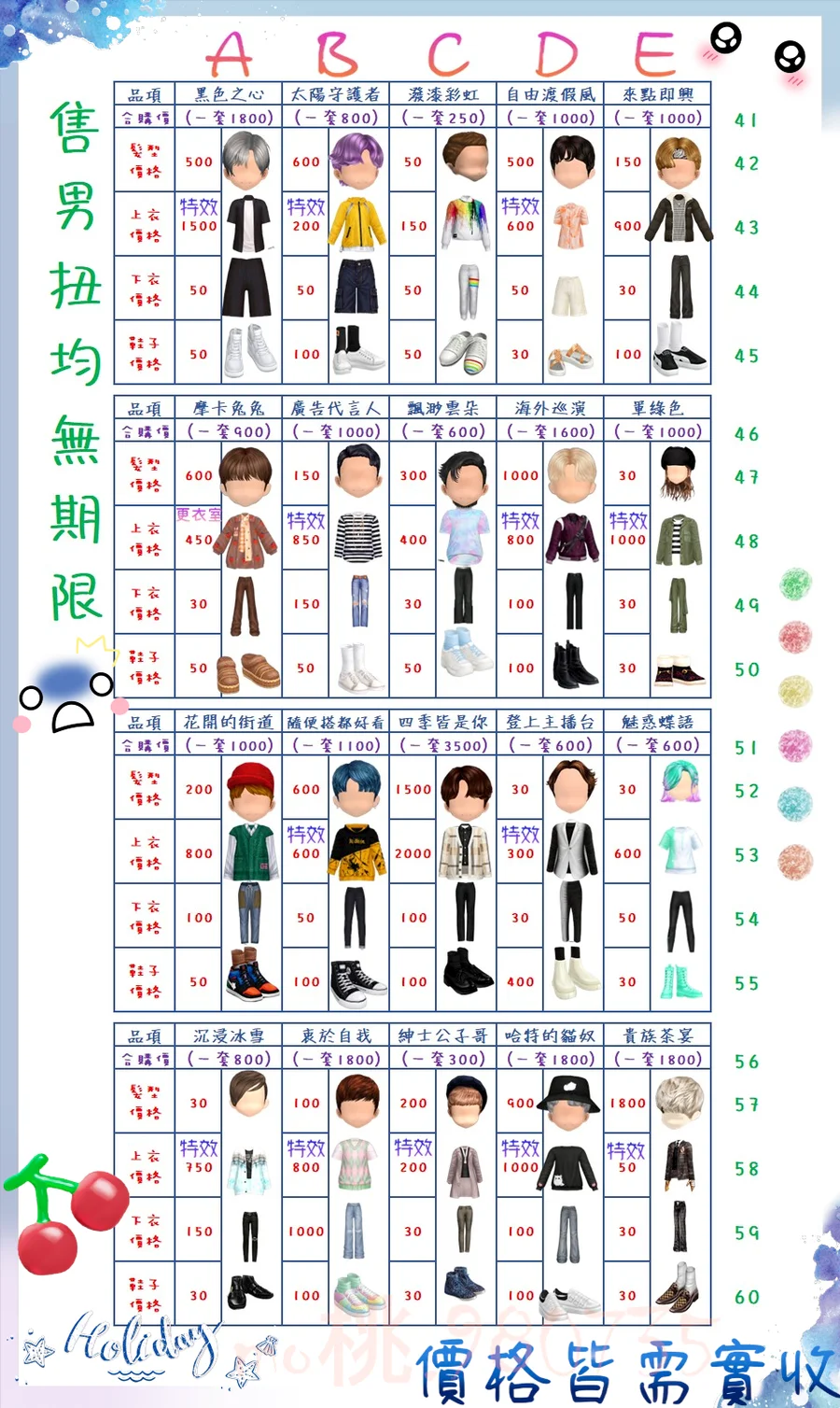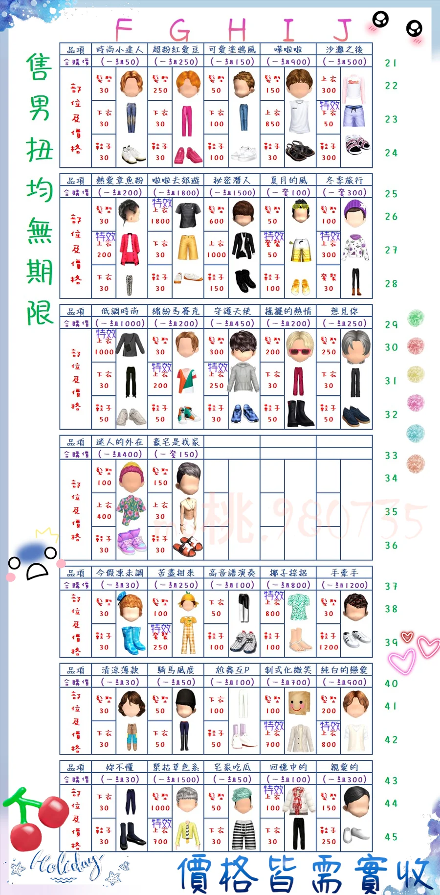 價格都是需要實收,另請先告知男生還女生的在附上編號!