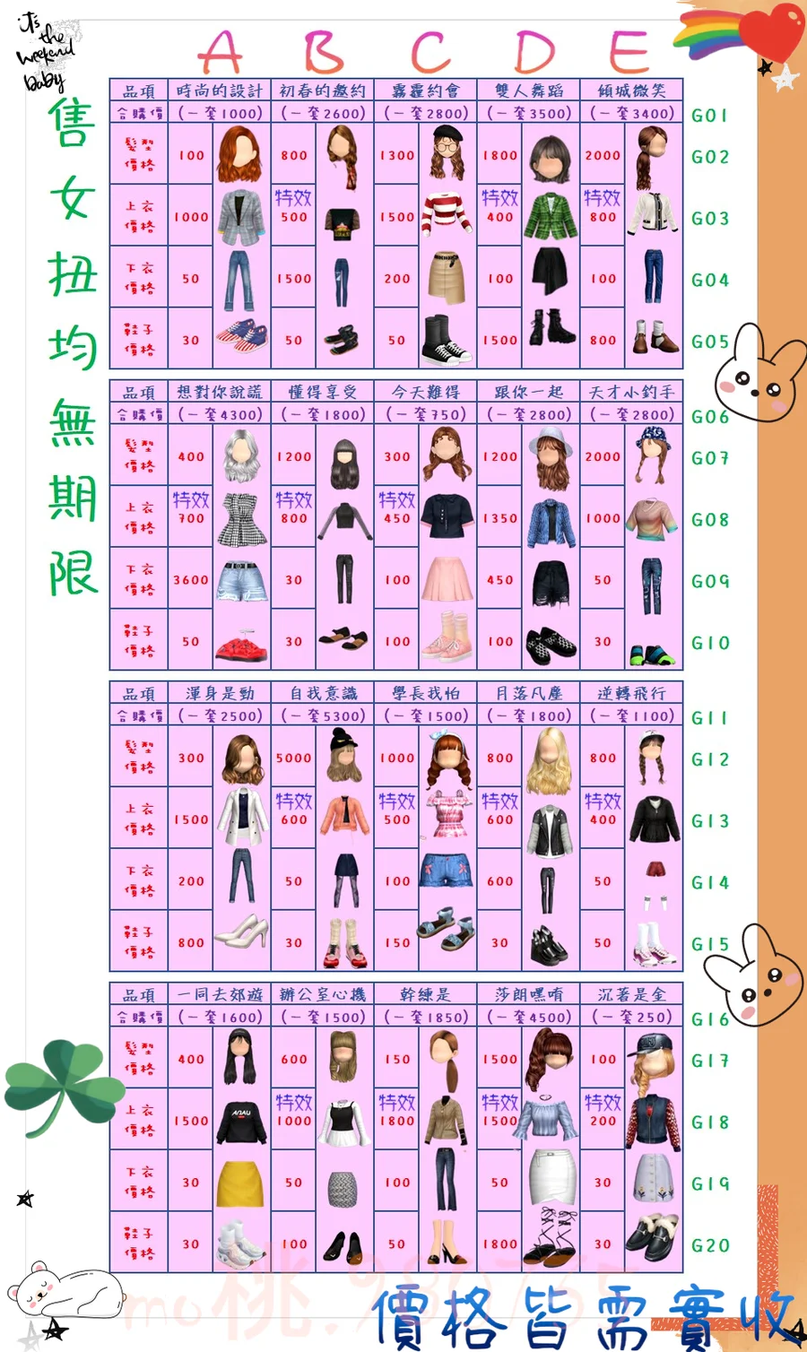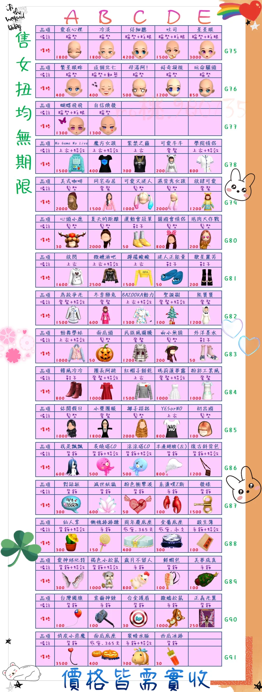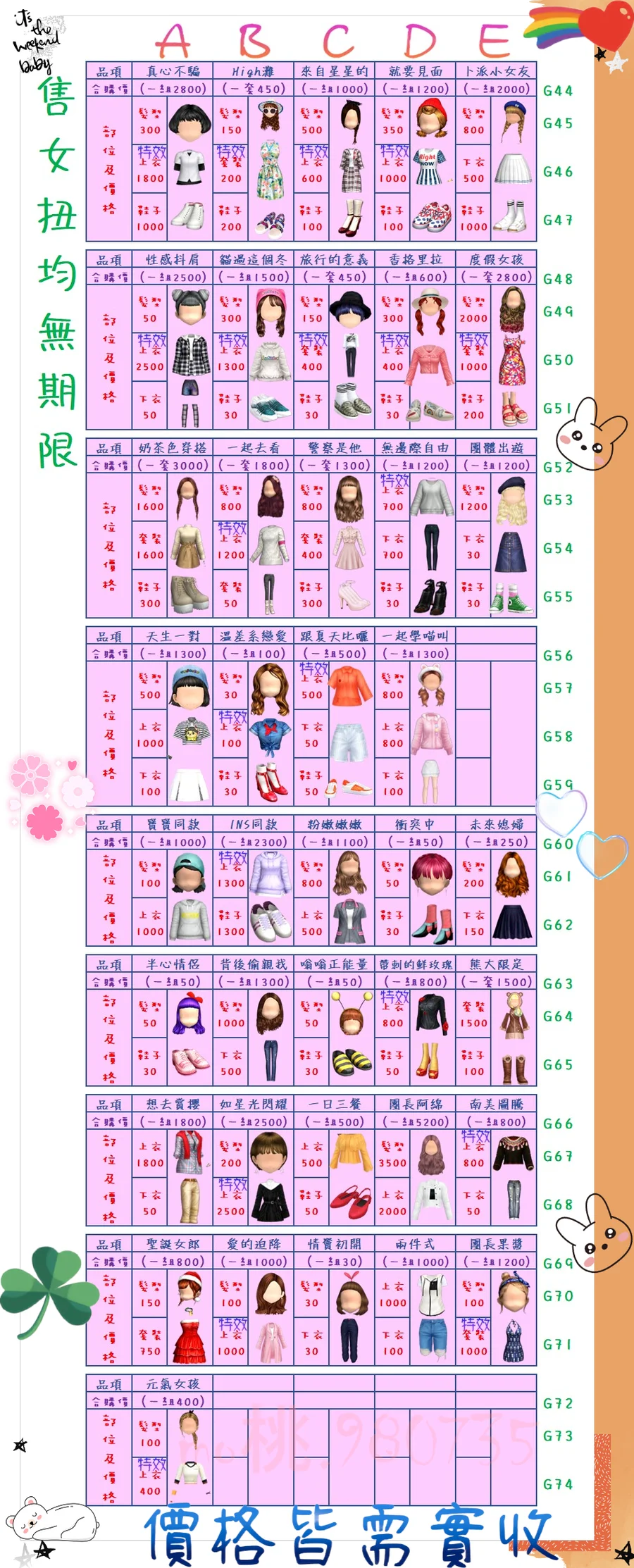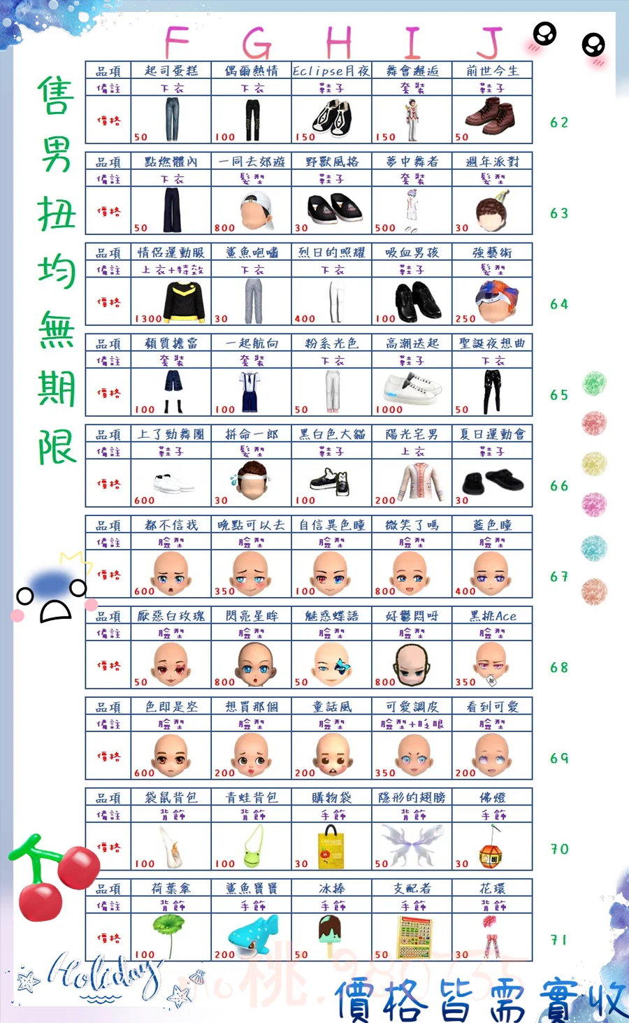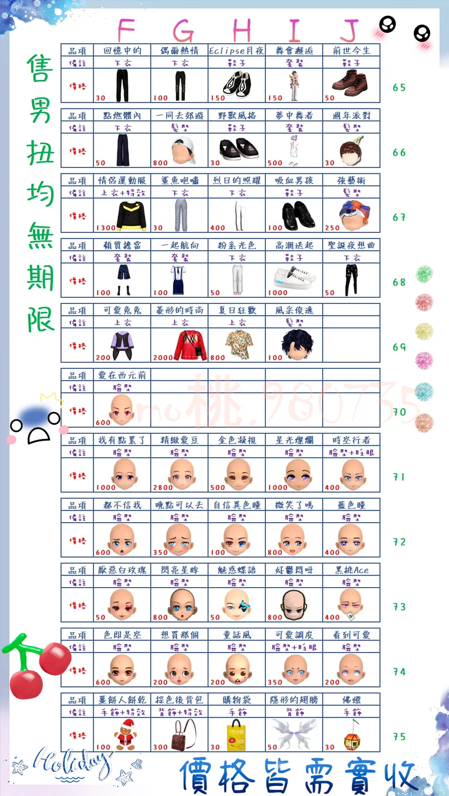 價格都是需要實收,另請先告知男生還女生的在附上編號!