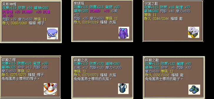 正常整套搭配為衣/帽/鞋/盾或是袍/帽/鞋/盾