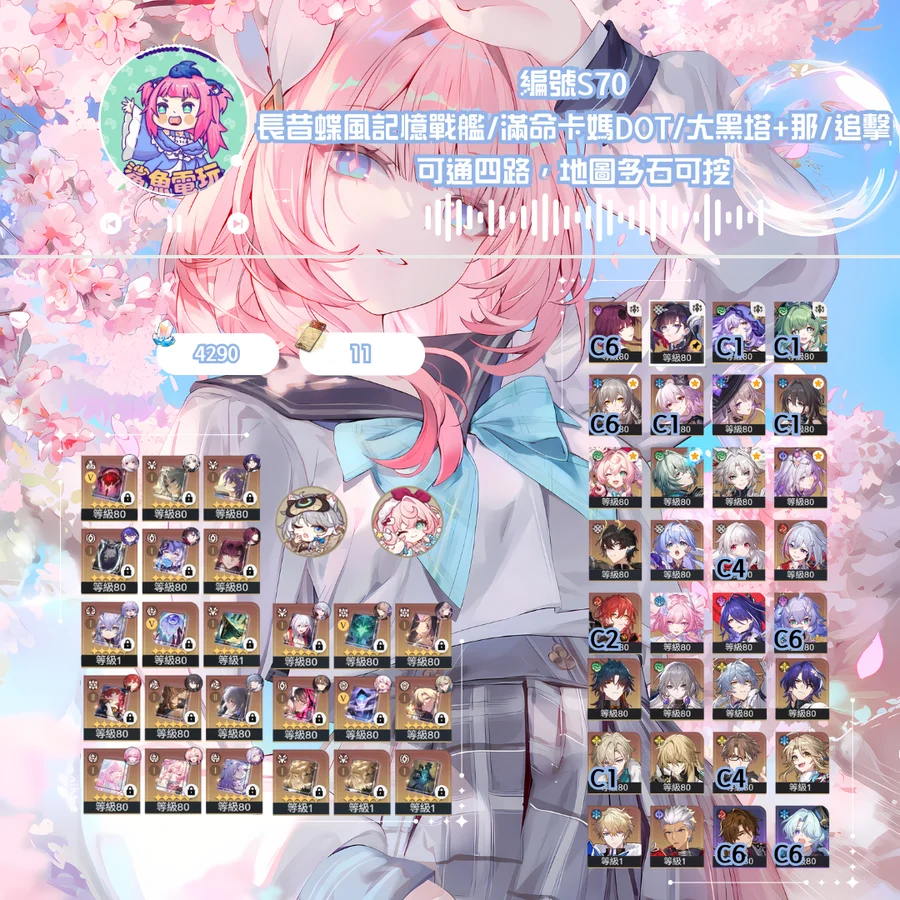 | *圖3 | 全員追擊隊大全+高金,全部限定角色全連專大畢業 | 650多抽以上可屯鳥滿命/XP滿命/強度滿命,昔版本主線等等都還沒動。新補蝶堇 | 15xxx |