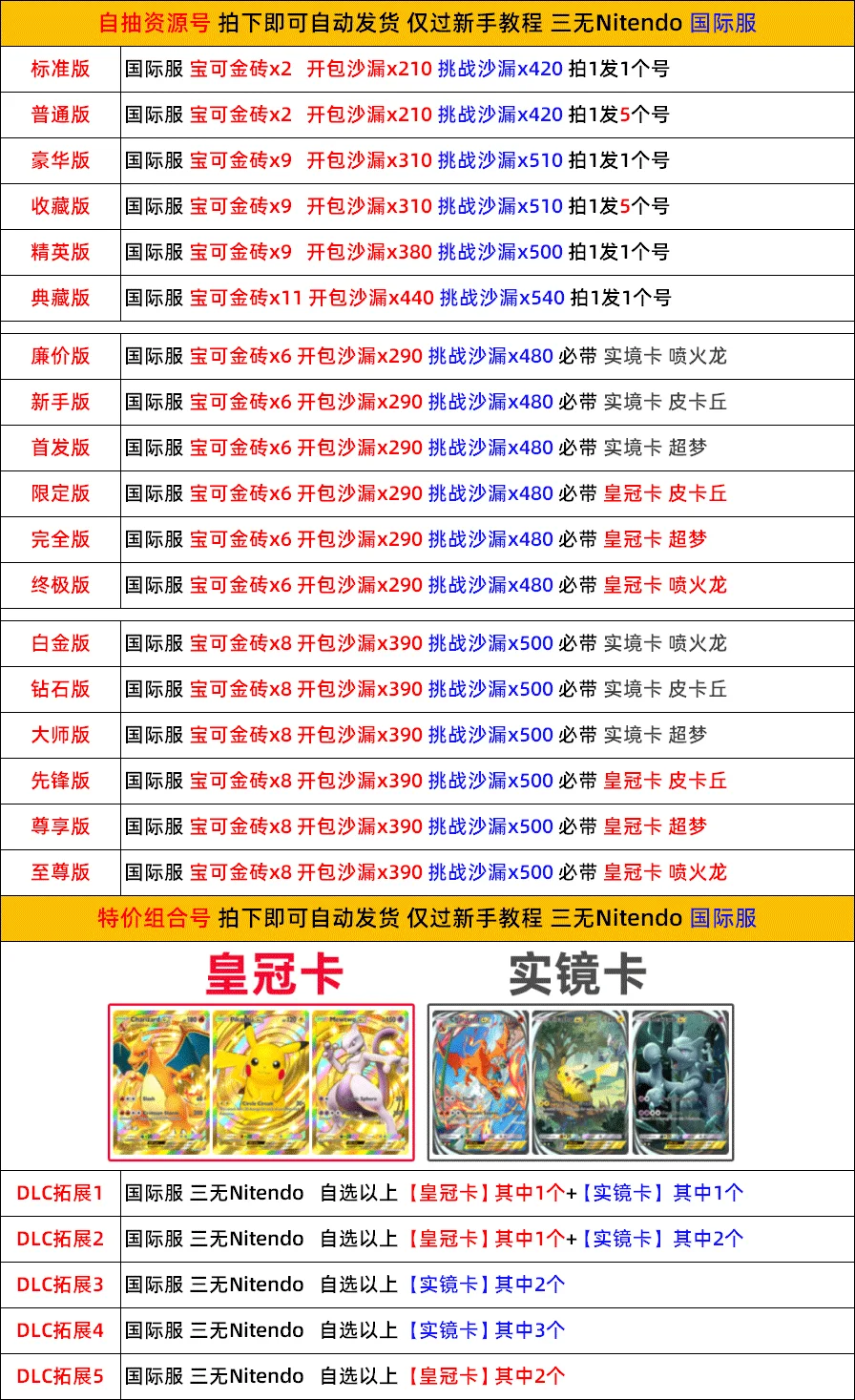 方案五:寶可金磚*6+開包沙漏*300+挑戰沙漏*480(「必帶皇冠卡」 皮卡丘or超夢or噴火龍 三選一)➡️299$