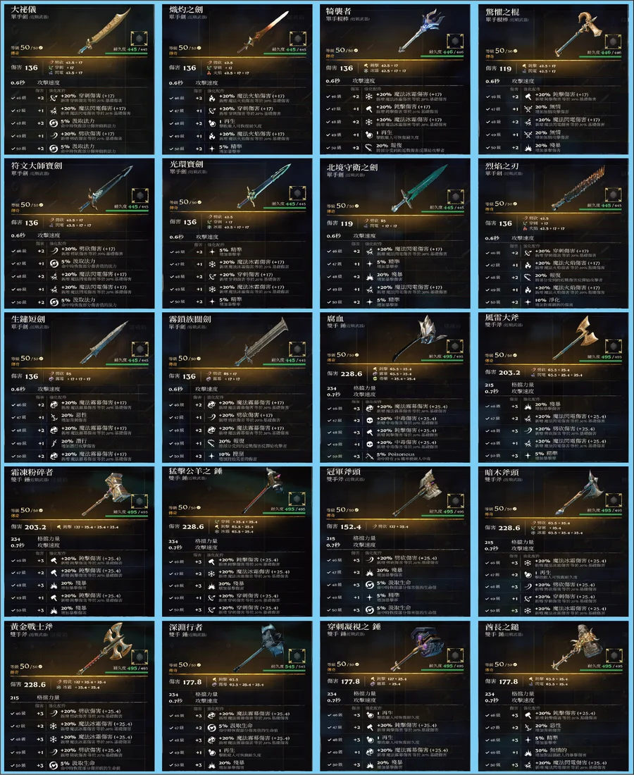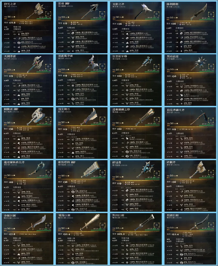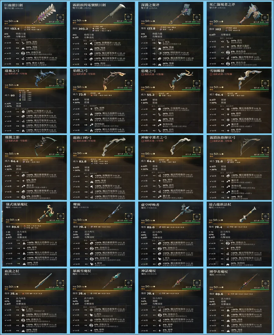 武器類目前已蒐集完畢,官方每次小更新都會再多放幾件舊裝備的40級版本,我會根據國外的武器圖鑑表格做更新