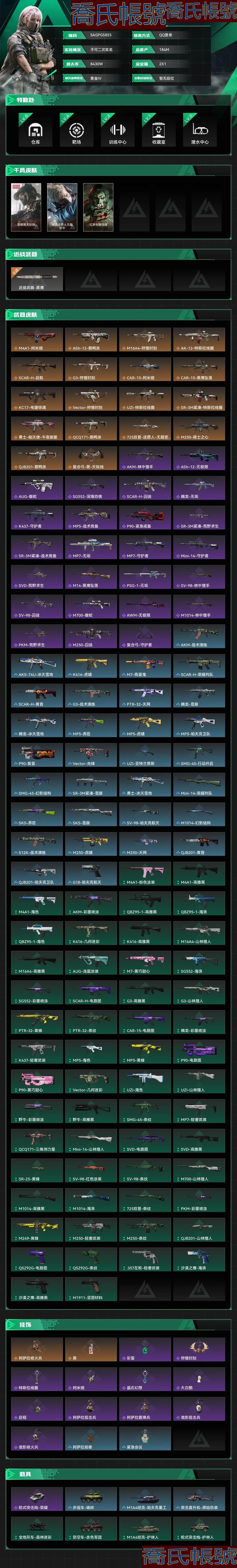 【OBSAGPG585542】總資產:184M,哈夫幣:8430W,武器皮膚131;烽火52級:黃金Ⅳ,戰場:暫無段位,【安全箱】基礎安全箱;【特勤處等級】倉庫LV.6,靶場LV.4,訓練中心LV.4,收藏室LV.1,潛水中心LV.0;【捆綁包5】鵝鴨殺捆綁包,黑天際線捆綁包,電鋸驚魂幹員捆綁包,狩獵時刻捆綁包,特斯拉線圈捆綁包;【幹員皮膚3】露娜黑天際線,蜂醫送葬人無題密令,紅狼電鋸驚魂;【近戰皮膚】近戰武器-黑鷹;【步槍皮膚】M4A1突擊步槍-阿米婭,ASh-12戰鬥步槍-鵝鴨殺,M16A4突擊步槍-狩獵時刻,AK-12突擊步槍-特斯拉線圈,SCAR-H戰鬥步槍-啟航,G3戰鬥步槍-狩獵時刻,CAR-15突擊步槍-阿米婭,CAR-15突擊步槍-黑鷹墜落,KC17突擊步槍-電鋸驚魂,AKM突擊步槍-林中獵手,ASh-12戰鬥步槍-無極限,AUG突擊步槍-蝮蛇,SG552突擊步槍-深海恐懼,SCAR-H戰鬥步槍-囚徒,騰龍突擊步槍-無垢,K437突擊步槍-守護者;【衝鋒槍皮膚】Vector衝鋒槍-狩獵時刻,UZI衝鋒槍-特斯拉線圈,SR-3M緊湊突擊步槍-特斯拉線圈,勇士衝鋒槍-能天使-午夜郵差,QCQ171衝鋒槍-鵝鴨殺,MP5衝鋒槍-戰術競備,P90衝鋒槍-緊急戒備,SR-3M緊湊突擊步槍-荒野求生,SR-3M緊湊突擊步槍-戰術競備,MP7衝鋒槍-無垢,MP7衝鋒槍-守護者;【射手步槍皮膚】Mini-14射手步槍-守護者,SVD狙擊步槍-荒野求生,M14射手步槍-黑鷹墜落,PSG-1射手步槍-無垢;【狙擊步槍皮膚】SV-98狙擊步槍-林中獵手,SV-98狙擊步槍-囚徒,M700狙擊步槍-蝮蛇,AWM狙擊步槍-無極限;【霰彈槍皮膚】725雙管霰彈槍-送葬人-無題密令,M1014霰彈槍-林中獵手;【輕機槍皮膚】M250通用機槍-騎士之心,QJB201輕機槍-鵝鴨殺,PKM通用機槍-荒野求生,M250通用機槍-囚徒;【復合弓皮膚】復合弓-黑-天際線,復合弓-守護者;【掛飾15】阿薩拉噴火兵,掛飾-黑,掛飾-彩蛋,掛飾-狩獵時刻,掛飾-特斯拉線圈,掛飾-阿米婭,掛飾-晶石幻想,掛飾-大白鵝,掛飾-啟程,阿薩拉狙擊兵,阿薩拉霰彈兵,詭影狙擊兵,詭影噴火兵;【載具8】輪式突擊炮-榮耀,步戰車-破碎,M1A4坦克-哈夫克重工,突擊直升機-原始偽裝,全地形車-森林迷彩,防空車-赤色軍團,M1A4坦克-護林人,輪式突擊炮-護林人;【AW子彈】15;【貨幣】1105三角卷,(資訊源於賣家釋出,實際資訊以驗號為準)【QQ登入】還有很多套裝卷
