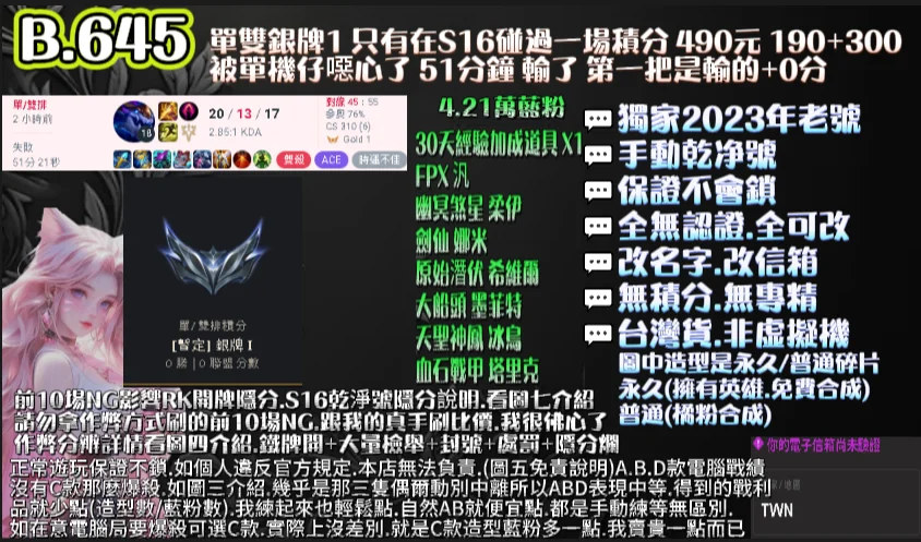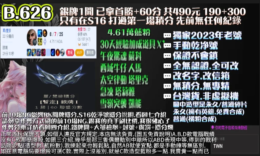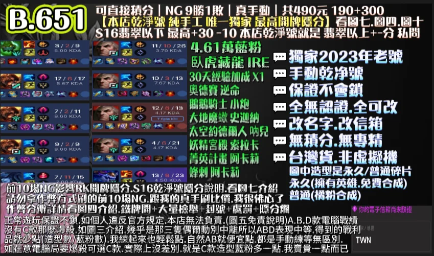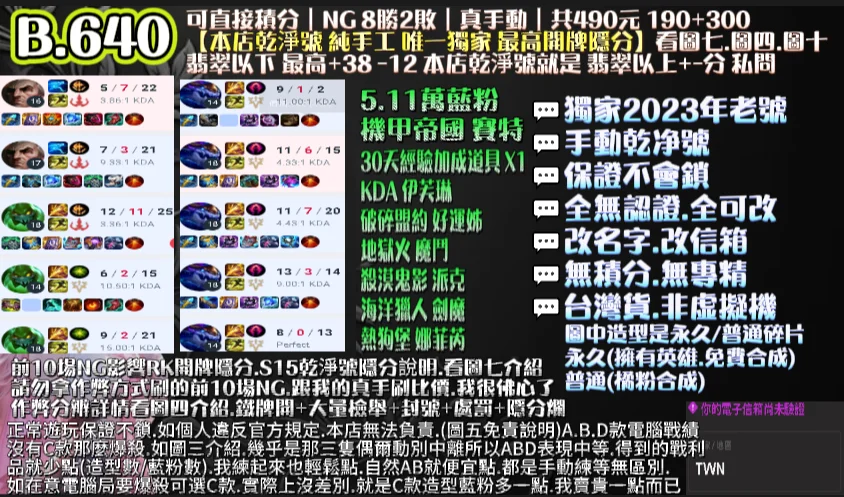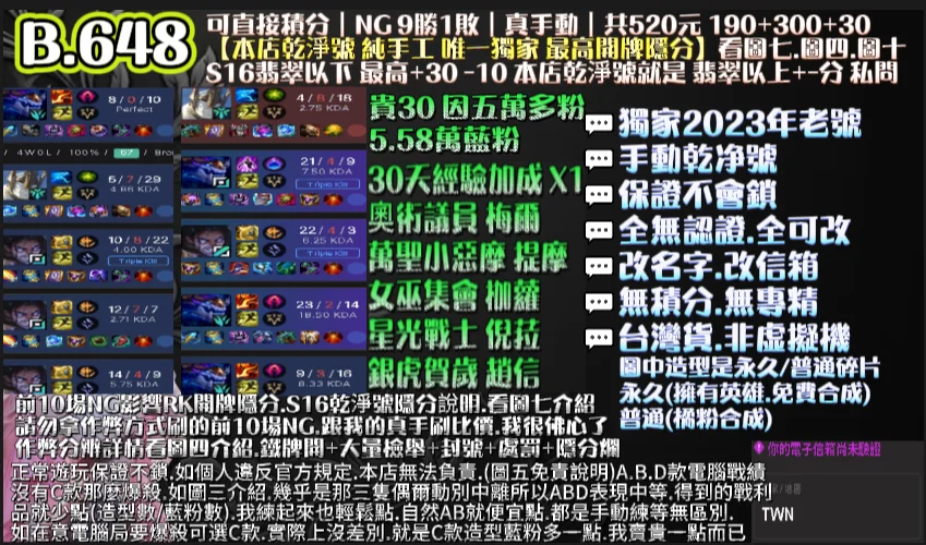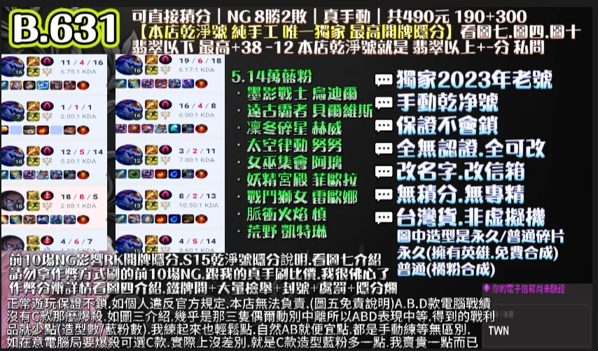 | 代刷10場NG保8勝+10把好KDA.即可拉高開牌隱分 |