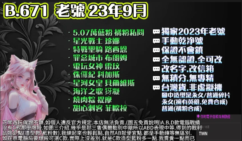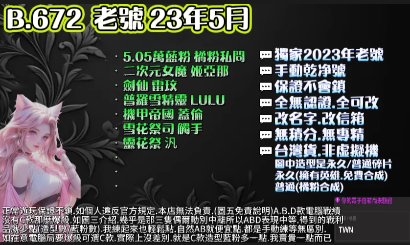 | 30等.4萬粉.4~7造型.3~6英雄.可挑造型.此賣場有圖可看 |