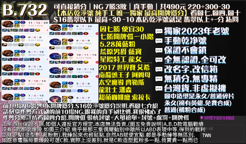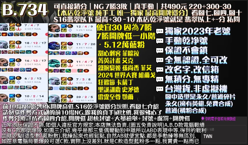 | 真手工代刷10場NG 好KDA+保8勝+6小時=拉高開牌隱分 |