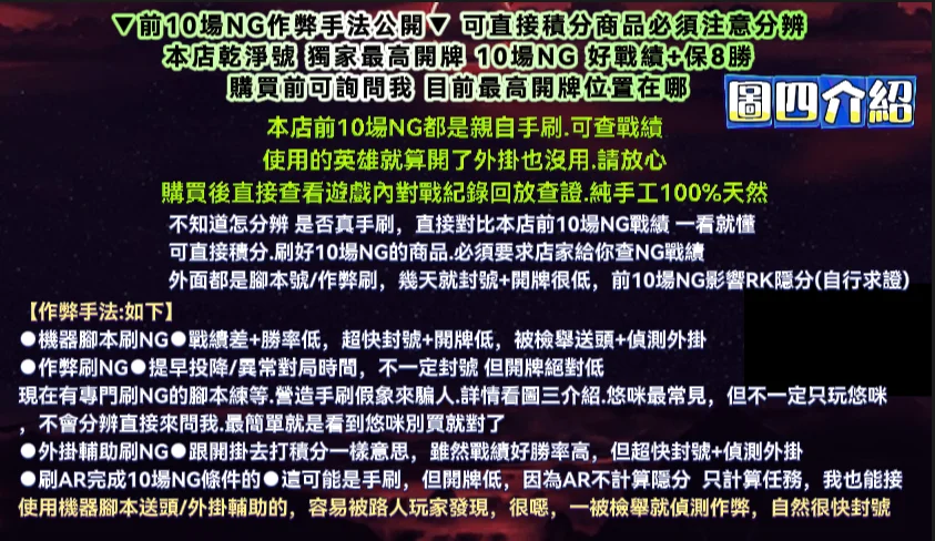 ⛔購買可直接積分商品,一定要求店家給你查詢前10場NG的戰績,直接對比本店10場戰績 就知道是不是真手刷 不會分辨就問我