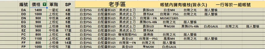 | 編號 | 價格 | 軍階 | SP | 新手區 帳號內擁有槍枝(皆永久) 一行等於一組帳號 | |||||||