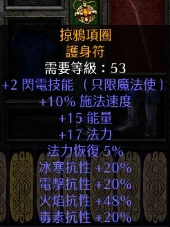 項鍊:2電10高施15能量17法法力恢復5%+20全抗48火抗(53級) 280