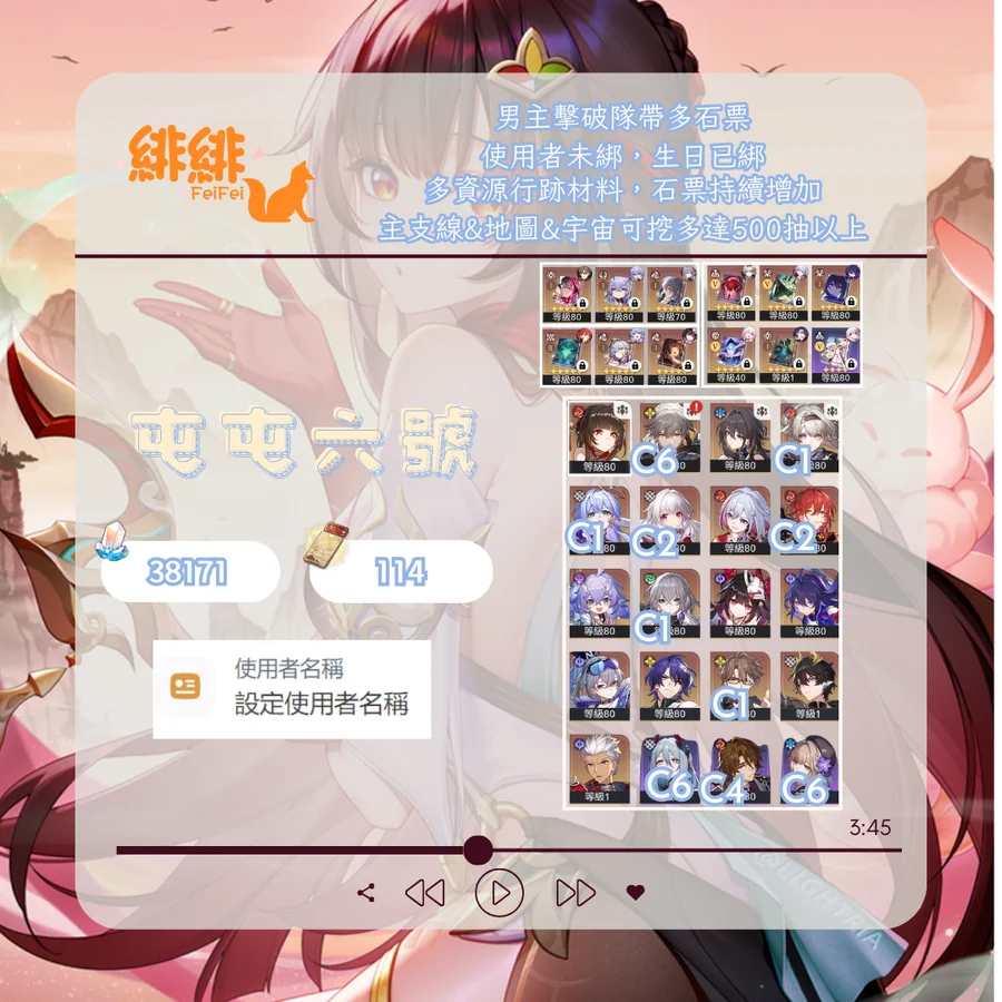 ┊每隻帳號固定會有一隻畢業練度隊伍+多備體燃料,不用擔心買來後像自抽號一樣低練度打的痛苦,還要等每天體滿後培養和吃燃料培養還難推過主線,不能保證三路全通,以追主線為主,正也因為跟其他自抽號不太一樣,所以會偏貴點