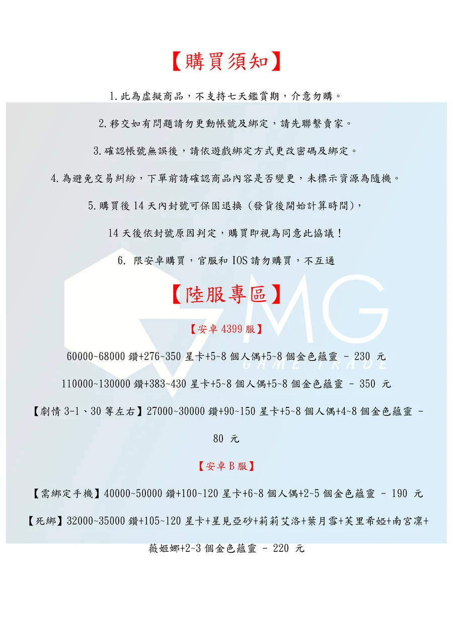 6. 限安卓購買,官服和IOS請勿購買,不互通